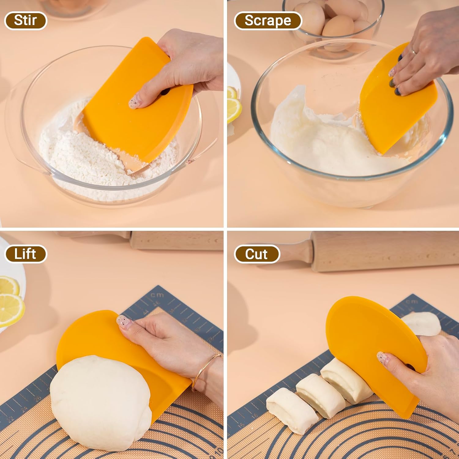 - Multifunctional Baking Tools : This flat edge silicone bowl scraper is easy to meet your baking need. Use our silicon pastry scraper to divide the dough and fold the moist sourdough, which can prevent the dough from getting on your hands. The dish scraper also can play a great role in scraping leftover food from plates and bowls.