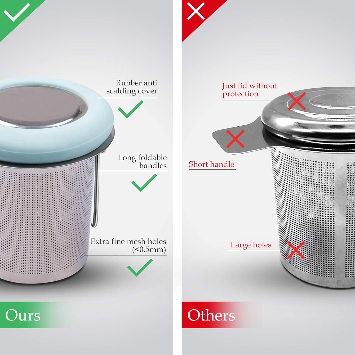 - [Premium Quality] The tea cup strainer is made of high quality 304 stainless steel. All parts are made of safe material, there is no harm to body, no special smell and not contain any harmful chemicals. The tea mesh is extra fine, with over 6000 water holes, round holes as low as 0.5mm. This means a better cup of tea with fewer floaties and smoother flavor. A definite must-have for tea lovers.