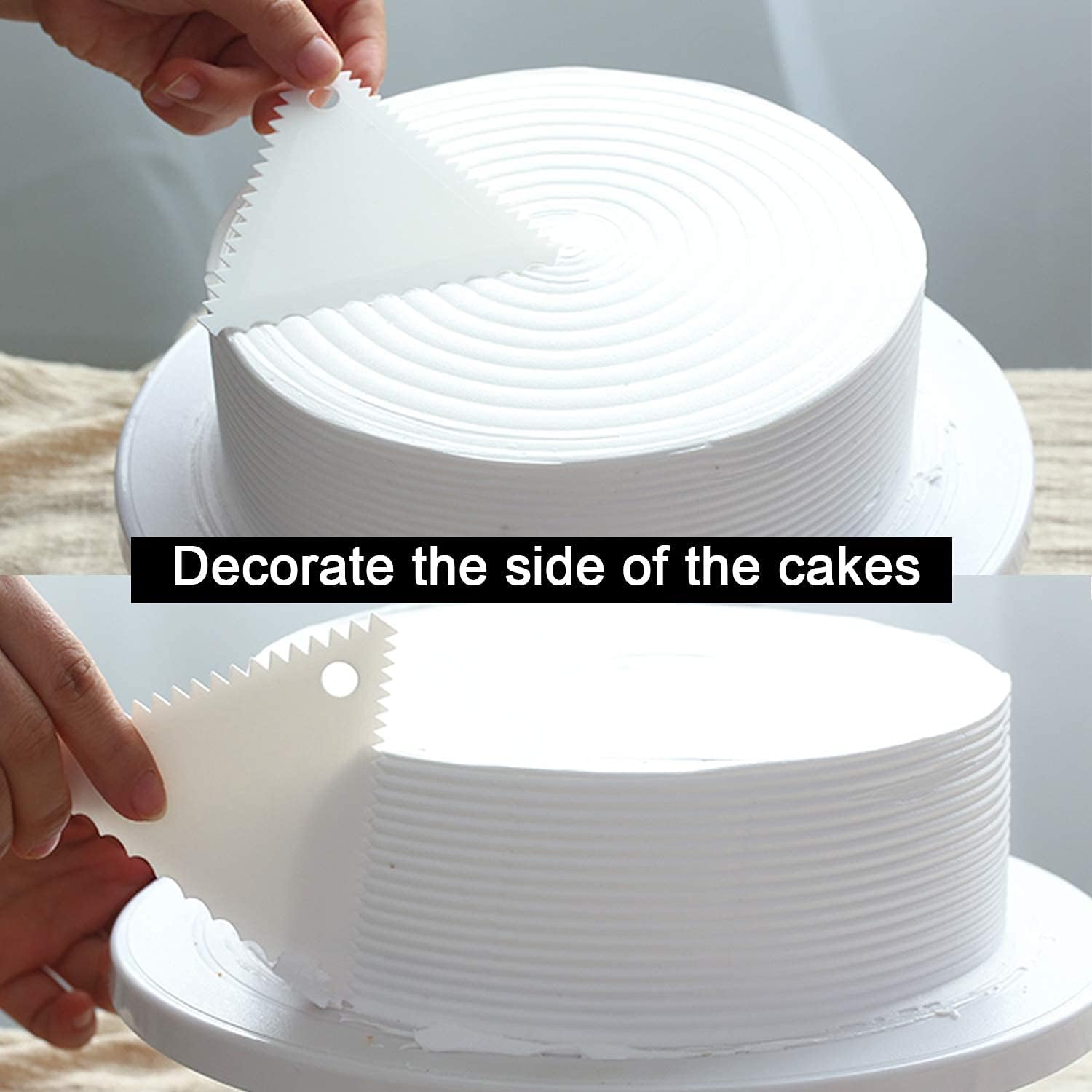 - PACKAGE INCLUDES- 6 Pcs stiff cake smoother in different serrated tooth and shapes from small to large plus 4 Pcs clear thin cake decorating scraper. Each scraper is designed with a hole for easily storing except for the thin scraper. Rich combination and enough styles for your different cake decorating needs.