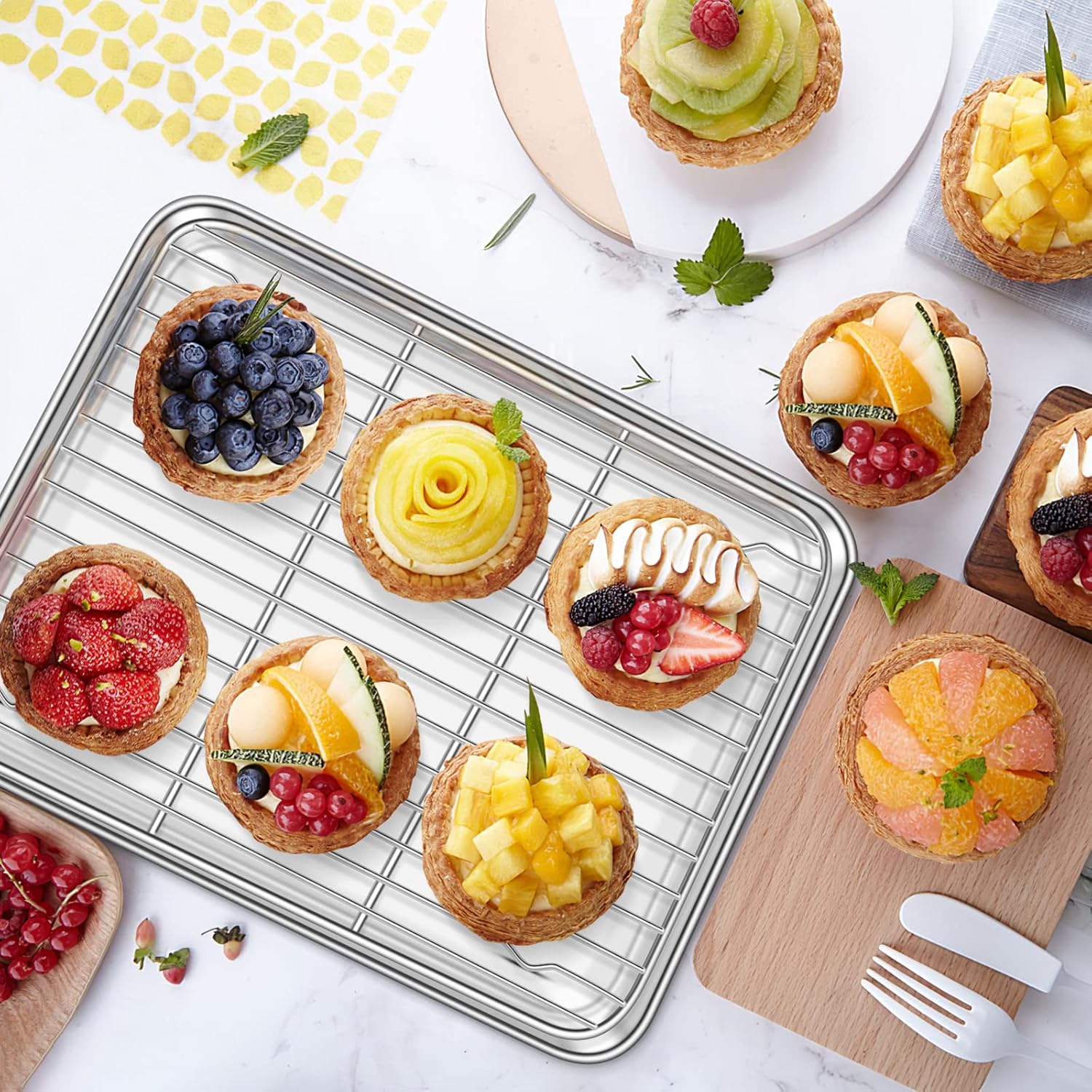 - 🍈 [SOLID CONSTRUCTION] Thick gauge with sturdy construction, these heavy-duty half sheet pans have a reinforced, rolled edge that provides extra strength to help resist warping in the oven. The cooling racks with raised feet facilitate air circulation for evenly baked goods. Feel sturdy and solid in hands, durable for serving many years.