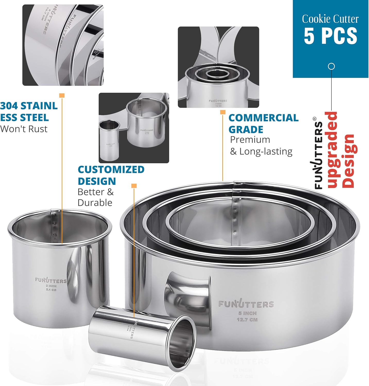 - Create a Fun At-Home Kitchen Bakery: Every cookie and biscuit cutter set comes with 1, 2, 3, 4, and 5 inches metal rings, each with a 2” depth, so you can expand those baking recipes and cookbook ideas to include cakes, pastries, scones, or even pizza.