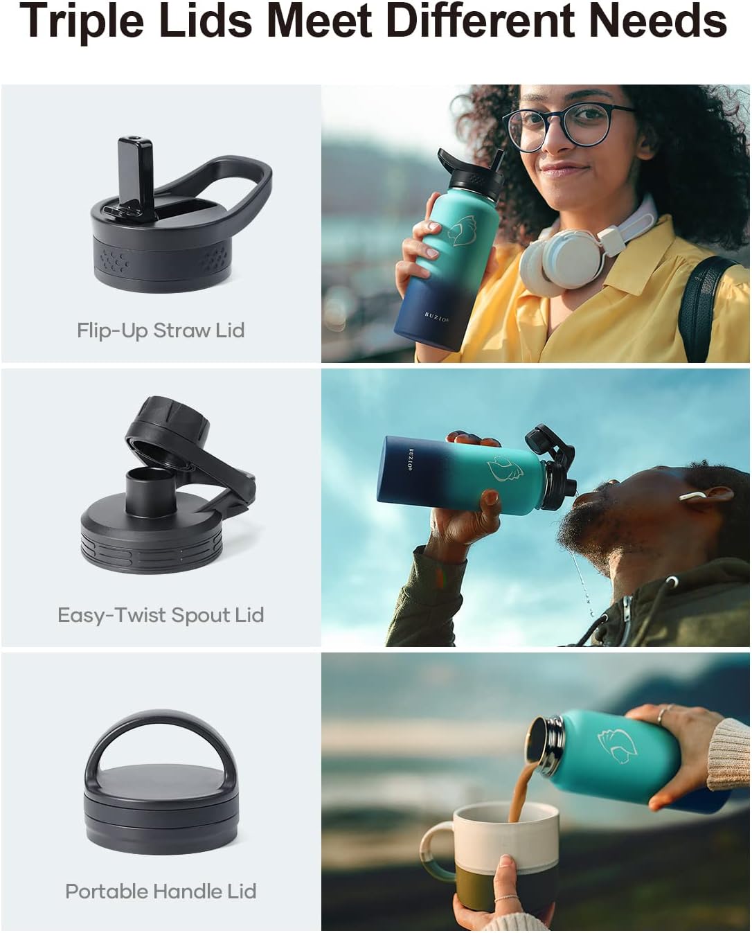 - 3 Caps Pack, 100% Leak-Proof: BUZIO stainless steel water bottle comes with 3 lids: portable handle lid, easy-twist spout lid, and flip-up straw lid to meet camping, hiking, cycling, fitness sports and more. Each lid has a thickened 360° seal for 100% leak-proof.