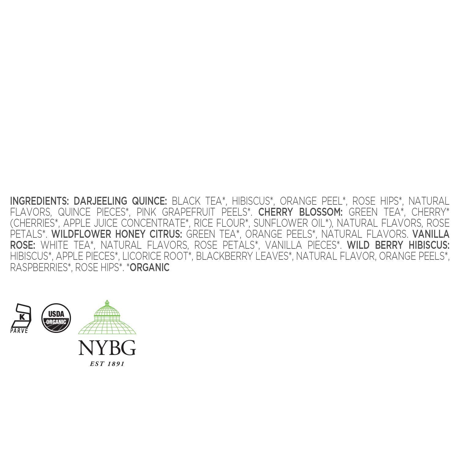 - Diverse Flavors - From only the finest whole tea leaves in the world, blended with aromatic fruits, spices and herbs, this sampler has 10 assorted pyramid tea infusers - Darjeeling Quince (black tea), Cherry Blossom (green tea), Wildflower Honey Citrus (green tea), Vanilla Rose (white tea), Wildberry Hibiscus (herbal tea).
