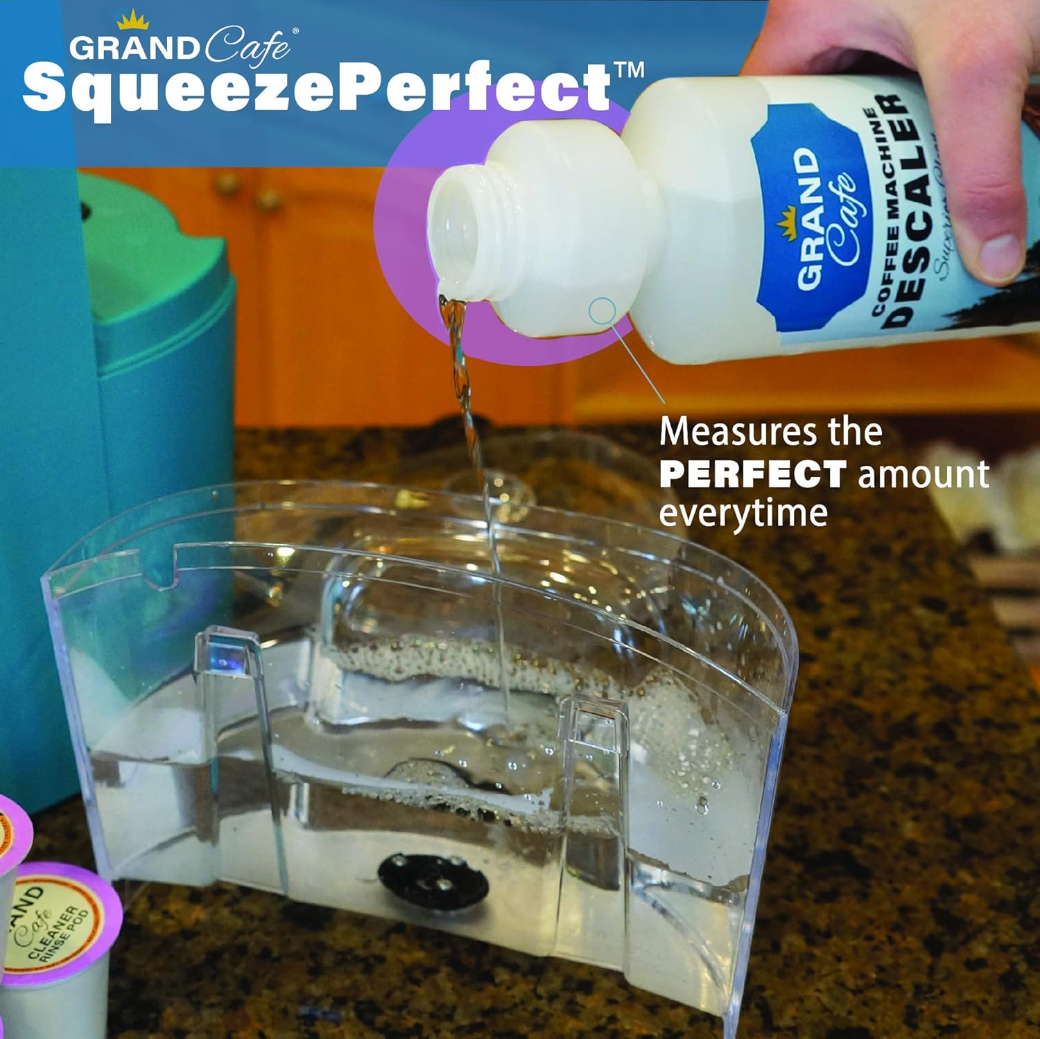 - Live the Grand Cafe Experience – With our innovative squeeze perfect bottle never guess or measure again when adding your descaler. Grand Cafe’s bottle measures the perfect amount every time simply by squeezing the bottle and filling the reservoir.