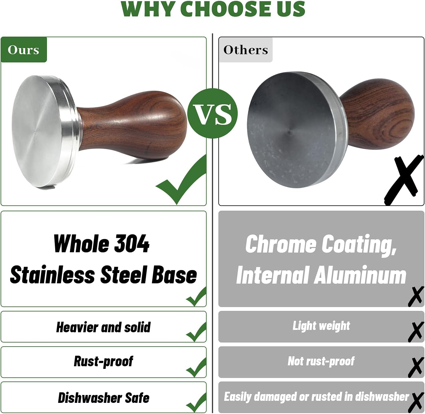 - ANTI-CORROSION: The thread of the interface between the wooden handle and the bottom is made of stainless steel, which will not rust and corrode when exposed to water, and is easy to clean. The bottom of the stainless steel compared to other products will not corrode and will not rust. The tamper base is dishwasher safe, but the handle is not.