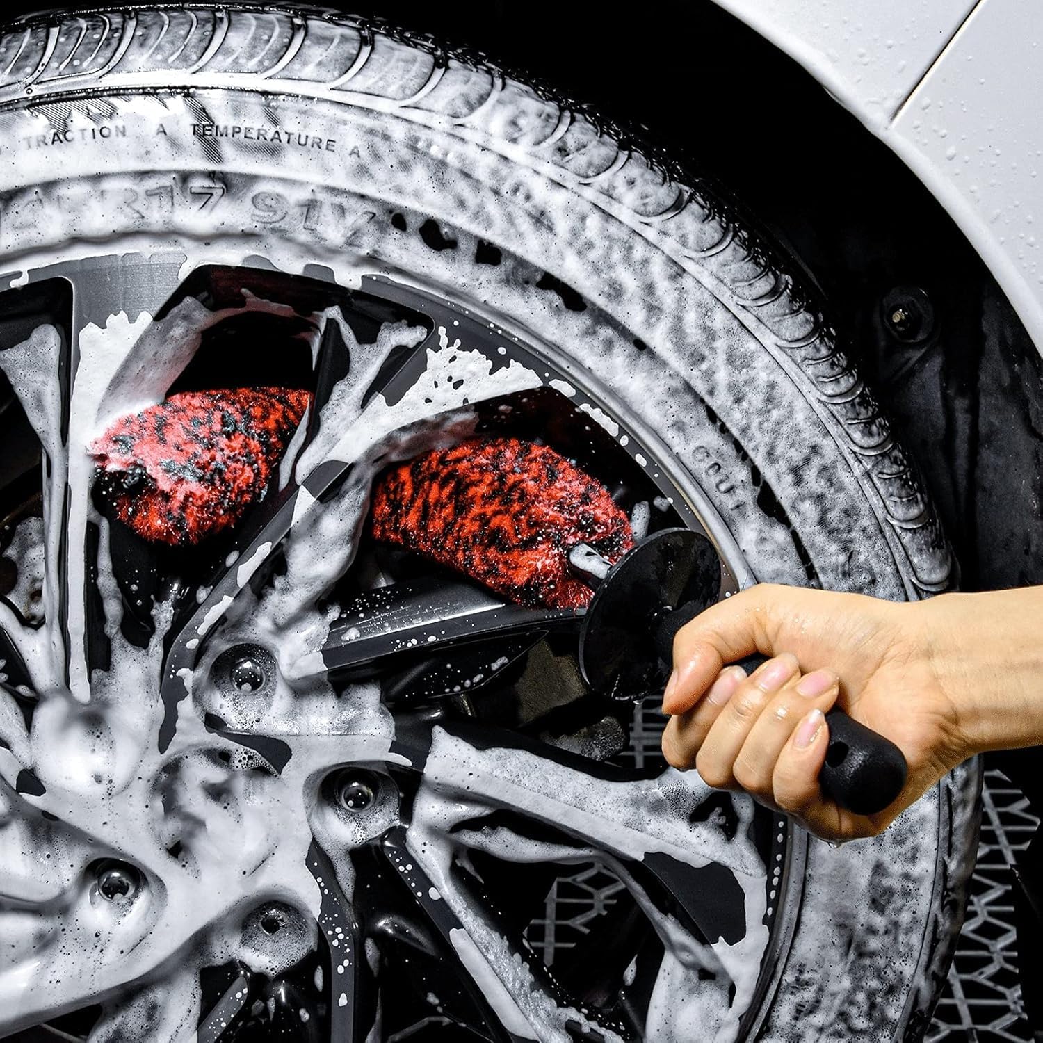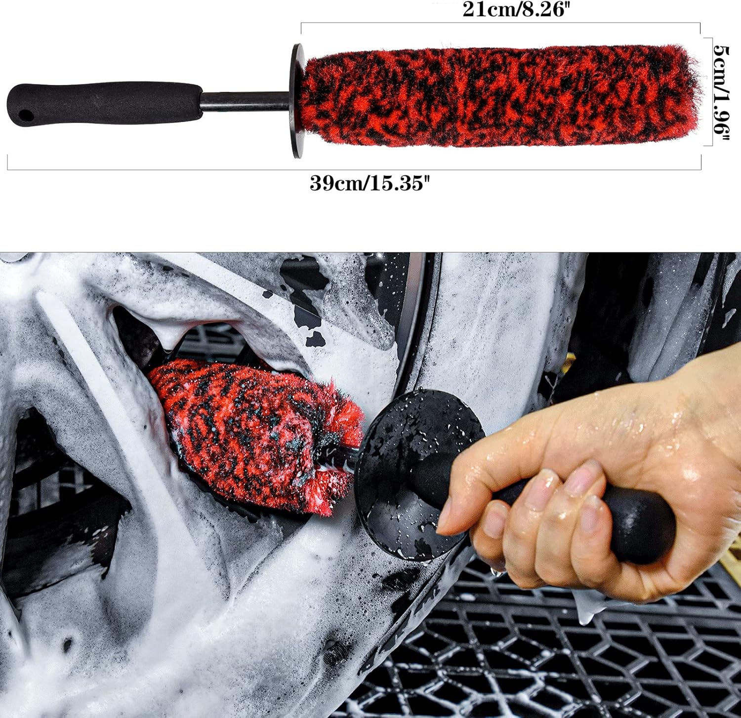 - 【PREMIUM MATERIAL】 Wheel soft brush is constructed of dense, soft, durable and environmentally friendly synthetic soft brsuh fibers. Withstands cleaning with any cleaner and will not leave streaks, scuffs, scratches or other damage to your vehicle's rims, even if they are painted.