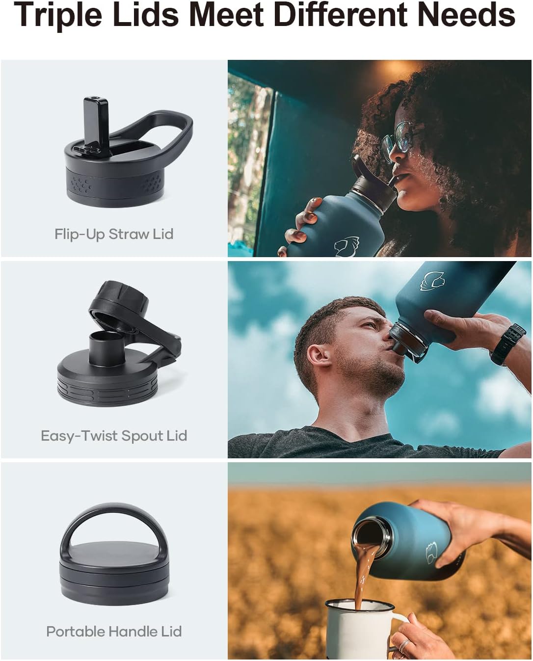 - 3 Caps Pack, 100% Leak-Proof: BUZIO stainless steel water bottle comes with 3 lids: portable handle lid, easy-twist spout lid, and flip-up straw lid to meet camping, hiking, cycling, fitness sports and more. Each lid has a thickened 360° seal for 100% leak-proof.