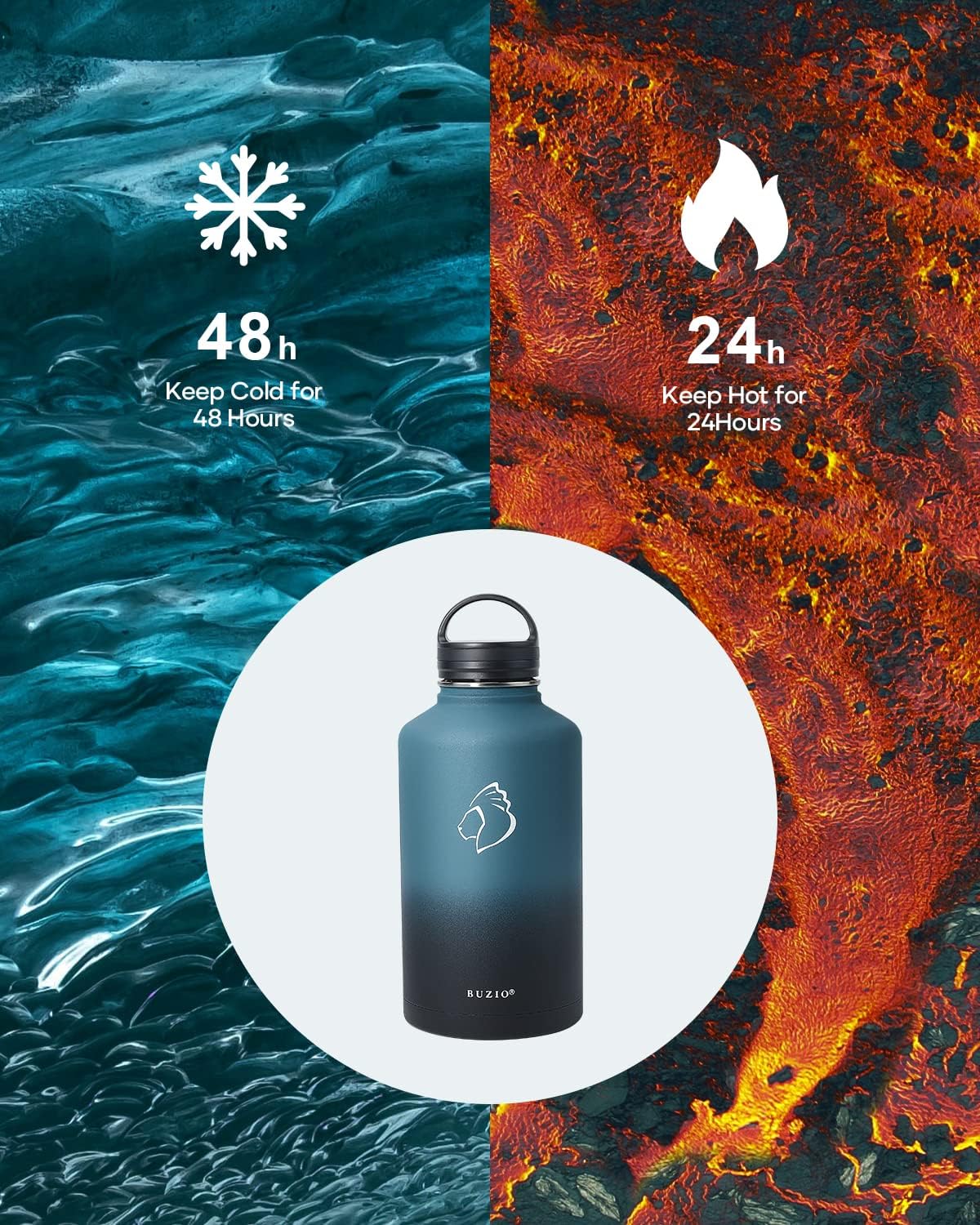 - There is Always One for you: BUZIO insulated water bottle meets your imagination in all aspects of drinking, from the comprehensive sizes (32oz-64oz) to classical and stylish designs, from the production materials to convenient accessories. Come to BUZIO, there is always one for you.