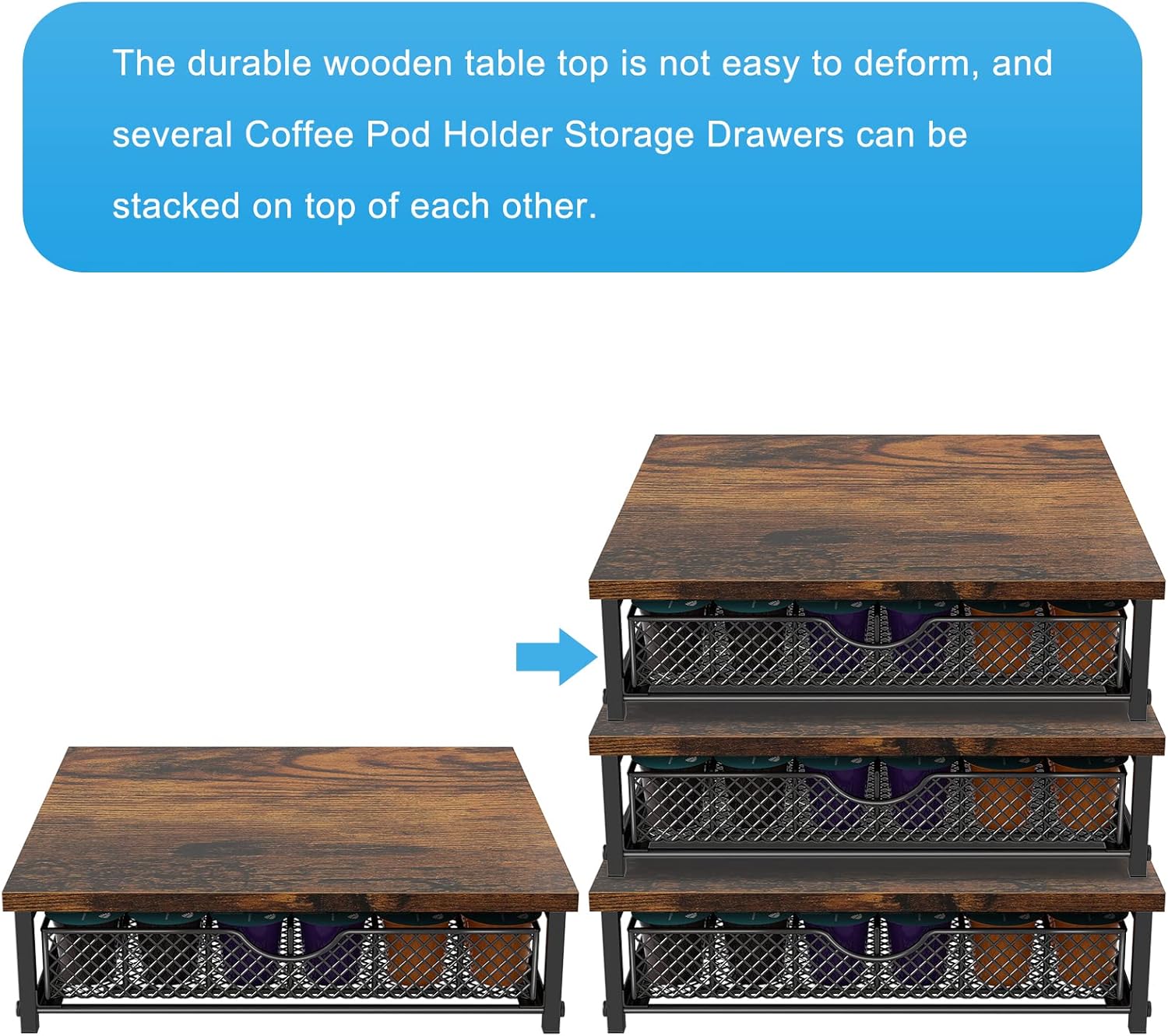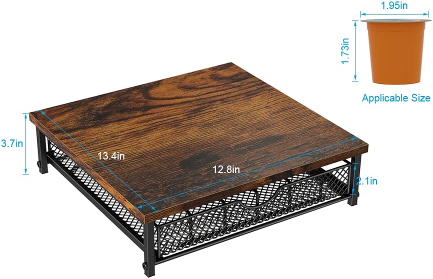 - 【STURDY AND STACKABLE】Sturdy wood worktop and metal frame provide strong support for drawers and coffee maker. You can stack other things on top of the plank, or even stack several coffee pods holder on top of each other.