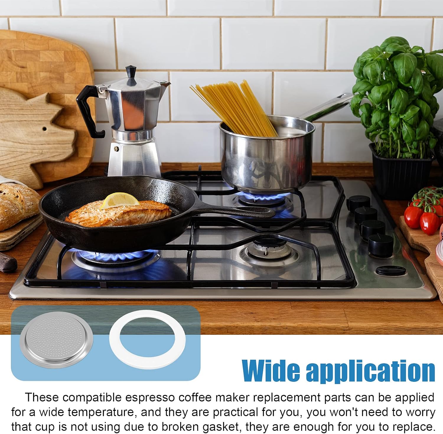 - Suitable size: these replacement gaskets and stainless steel filters can be compatible with 6-cup stainless steel espresso models,Φ55mm/2.16",Φ54mm/2.12",Φ72mm/2.83",Φ66mm/2.6", please measure the size of your pot before purchasing