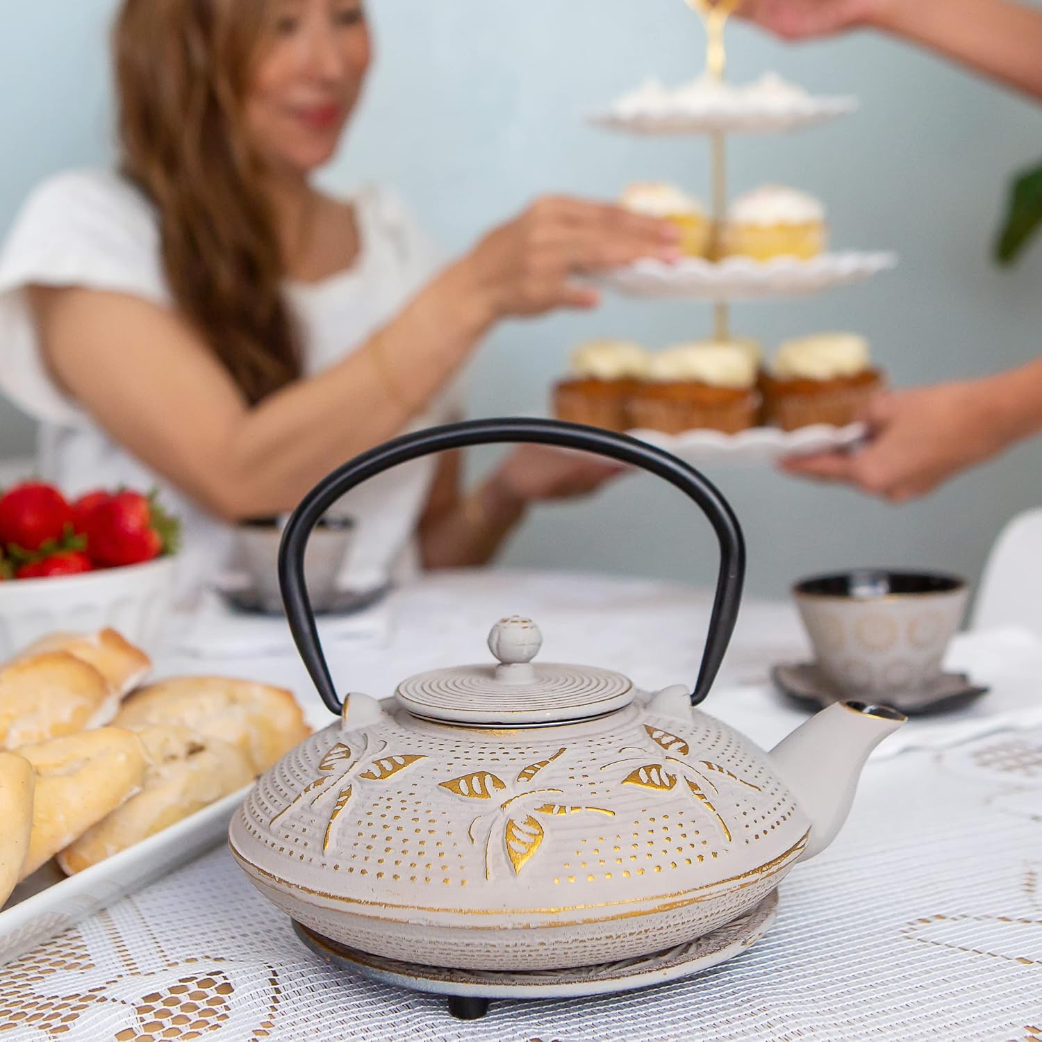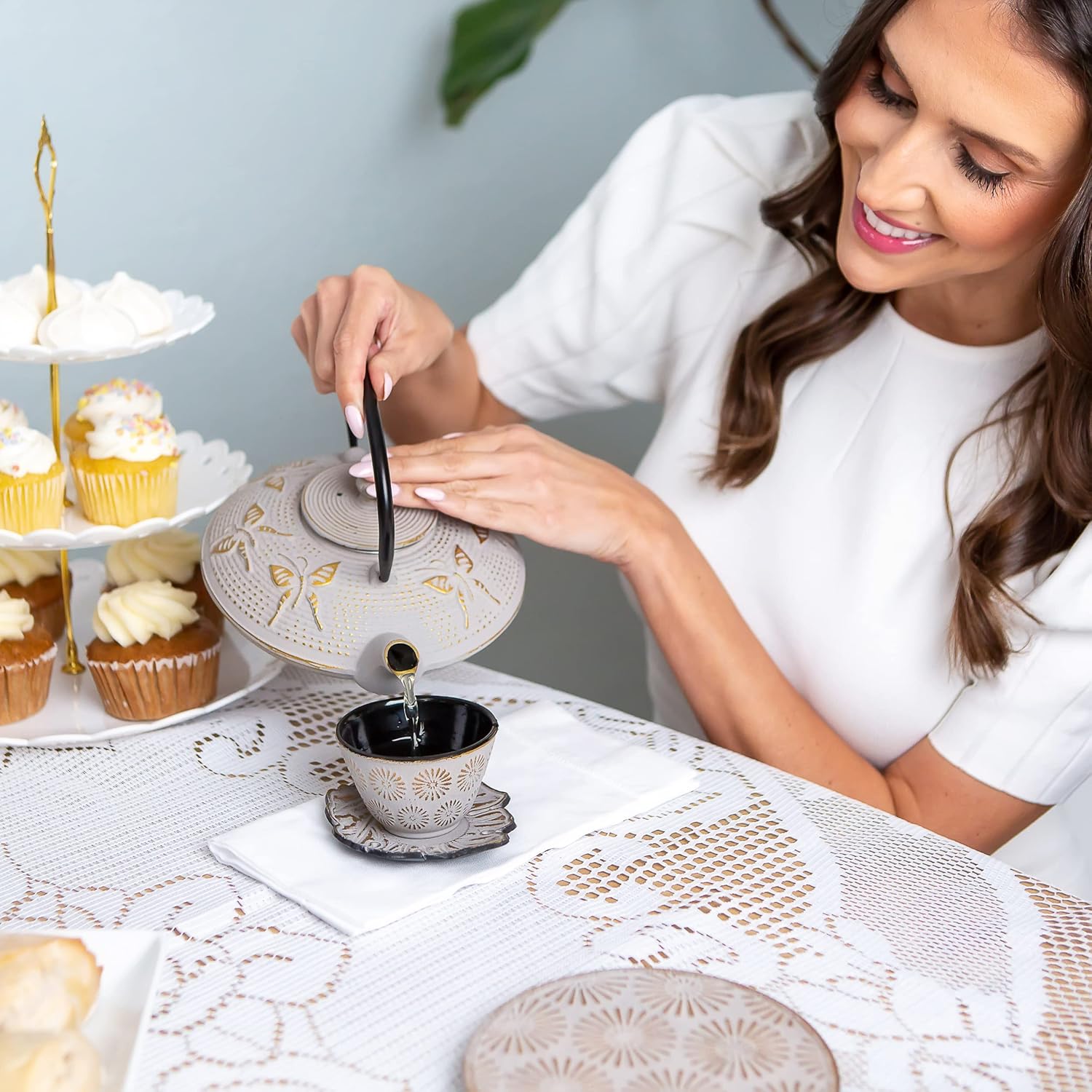 7PC Japanese Tea Set. "Sand Color" Cast Iron Tea Pot with 2 Tea Cups, 2 Saucers, Tea Infuser and Teapot Trivet. Ceremonial Matcha Accessories
