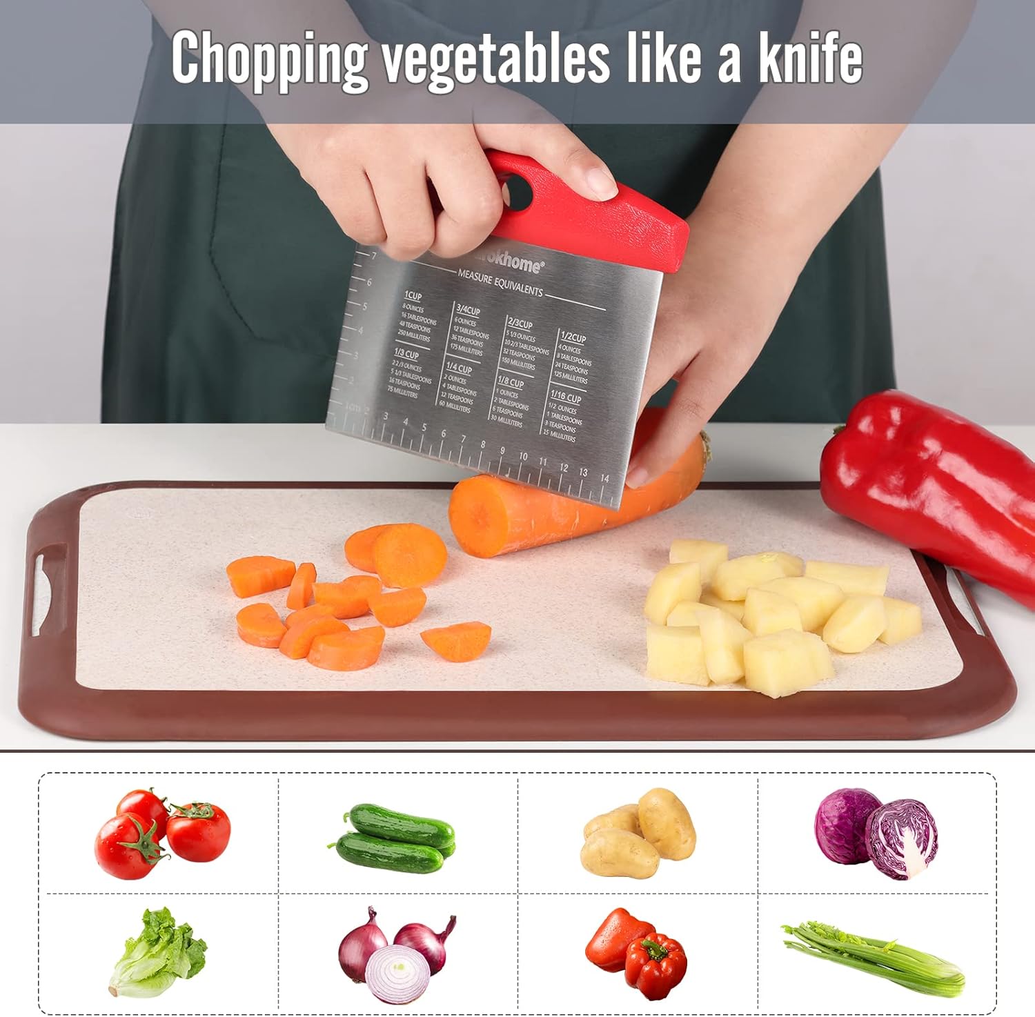 - Sharp bench scraper chopper: The pastry scraper is made from premium 430 stainless steel which is anti-rust and anti-deformation. The sharpness can stand the test of time and will give you a good clean cut for ingredients