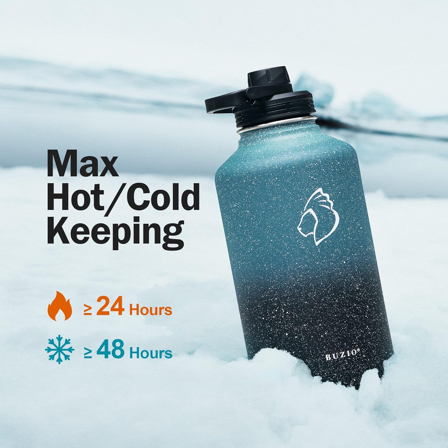 - Super Deal Combo: Buy 64oz insulated water bottle, get 7 accessories, a worry-free lifetime warranty, and friendly customer service. BUZIO water bottle with a delicate packaging box works as a perfect gift for your loved ones.