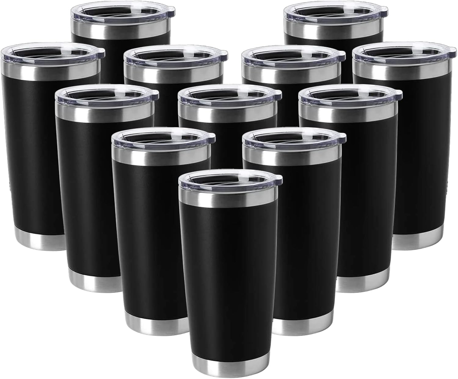 HASLE OUTFITTERS 20oz Tumblers Stainless Steel Mugs with Lid Double Wall Vacuum Insulated Coffee Cups for Cold & Hot Drinks (20oz-Black, 12 Pack)