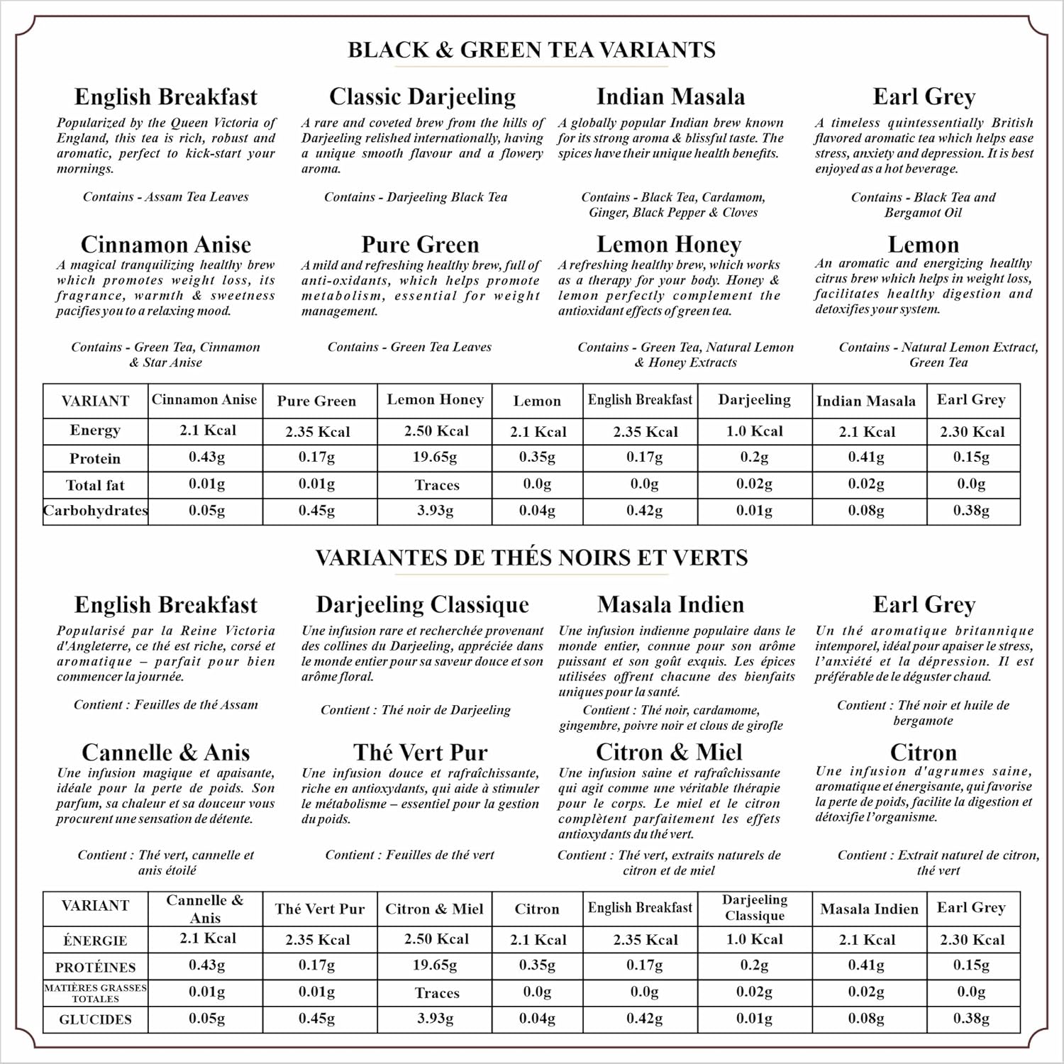 - Flavor : Pure Green tea , Cinnamon Anise Green tea, Lemon Green tea, English Breakfast, Classic Darjeeling, Indian Masala ChaiPure Green tea , Cinnamon Anise Green tea, Lemon Green tea, English Breakfast, Classic Darjeeling, Indian Masala Chai See more