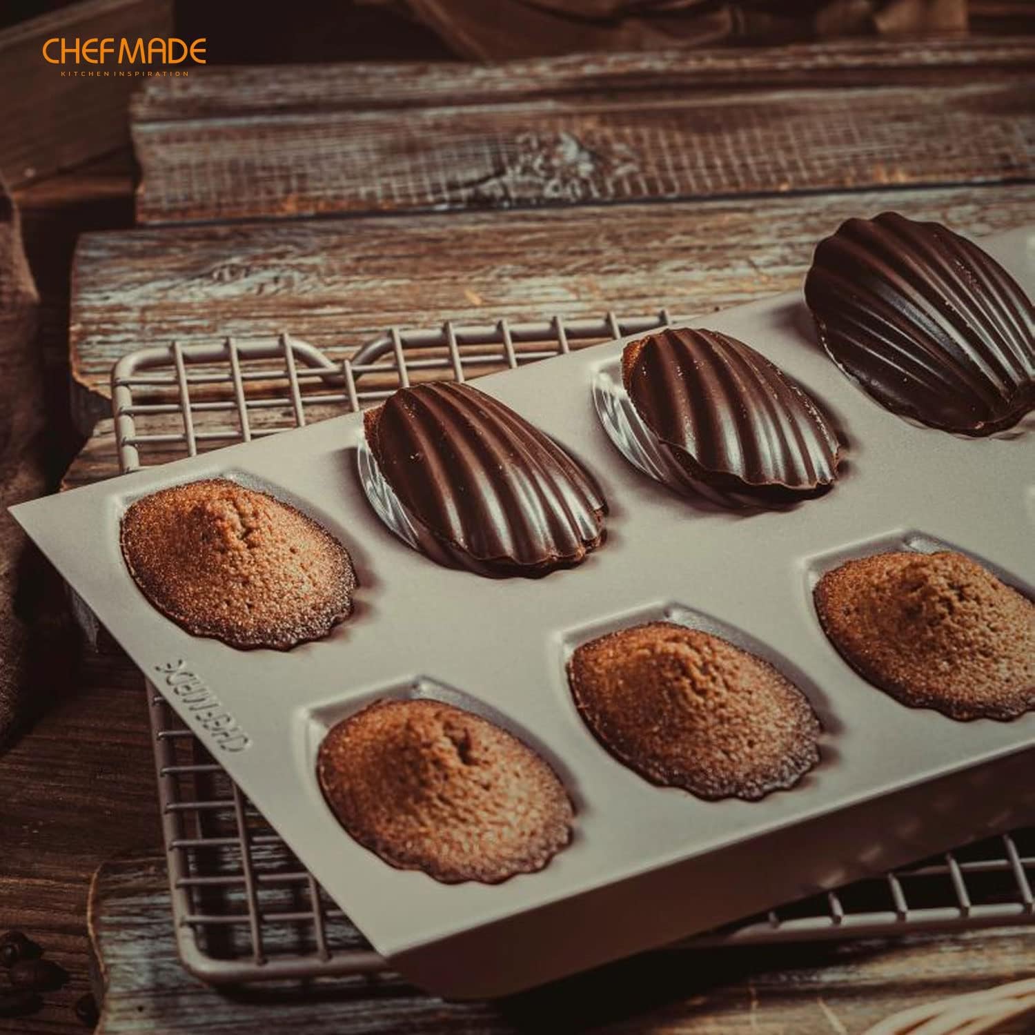 CHEFMADE Madeleine Mold Cake Pan, 12-Cavity Non-Stick Oval Shell Madeline Bakeware for Oven Baking (Champagne Gold)