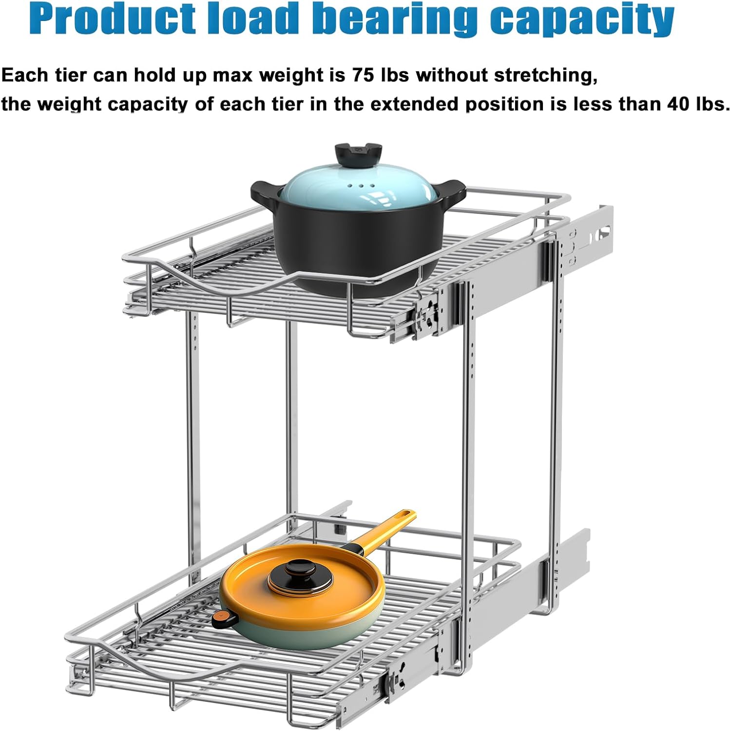 - ※ More Convenient and Practical: This Cabinet Slide Out Shelves both top and bottom shelves fully slide out independently on precision ball bearing slides so you can reach to your items easily and more quickly. Each tier can hold up max weight is 75 lbs without stretching, the weight capacity of each tier in the extended position is less than 40 lbs.