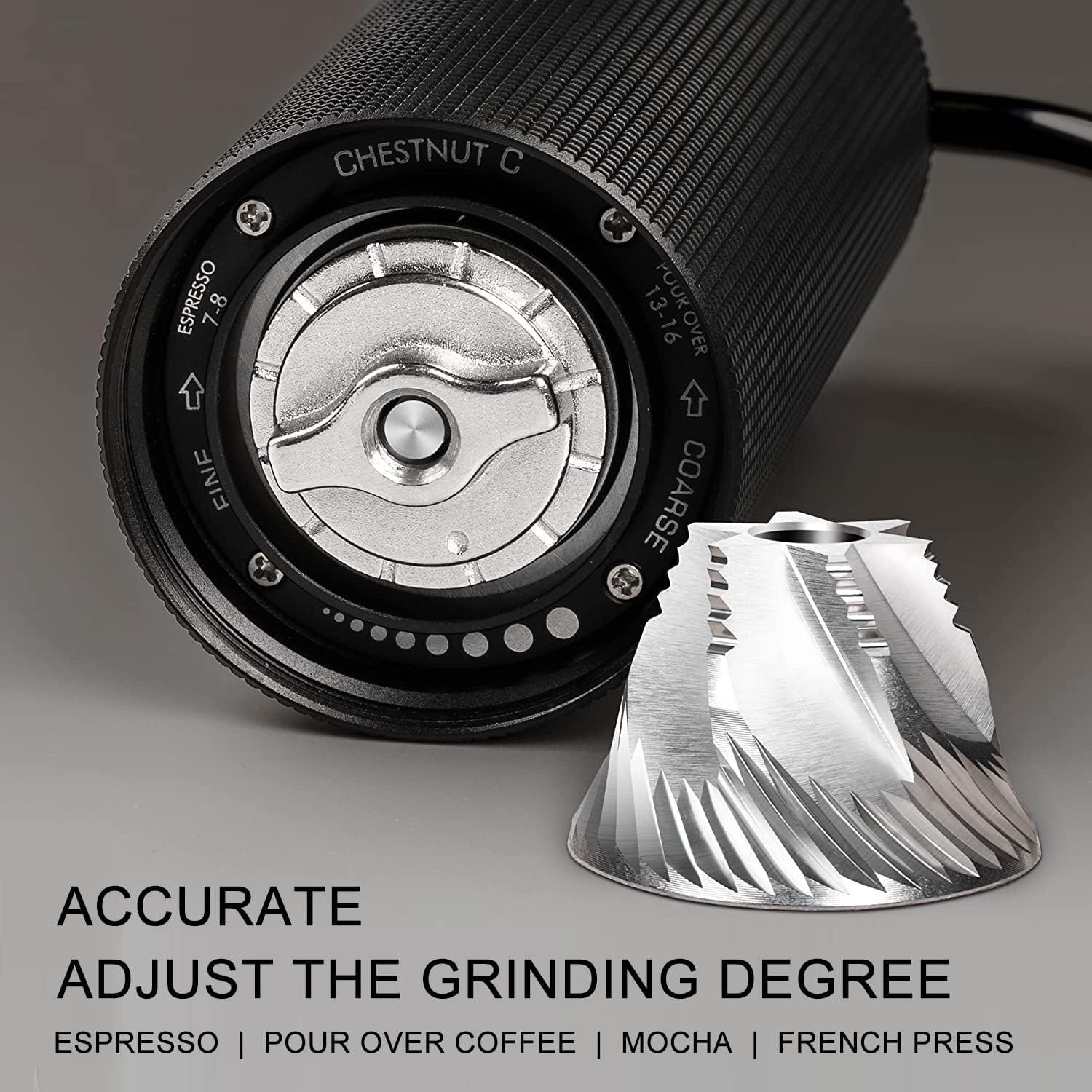 - [ Convenient To Carry & Clean Design ] C3 Manual bean grinder weight 700g , while maintaining a lightweight and a moderate sense of weight and luxury. It is ideal not only for home use but also for carrying outdoors or traveling. Easy to disassemble for cleaning - just be cleaned by brush