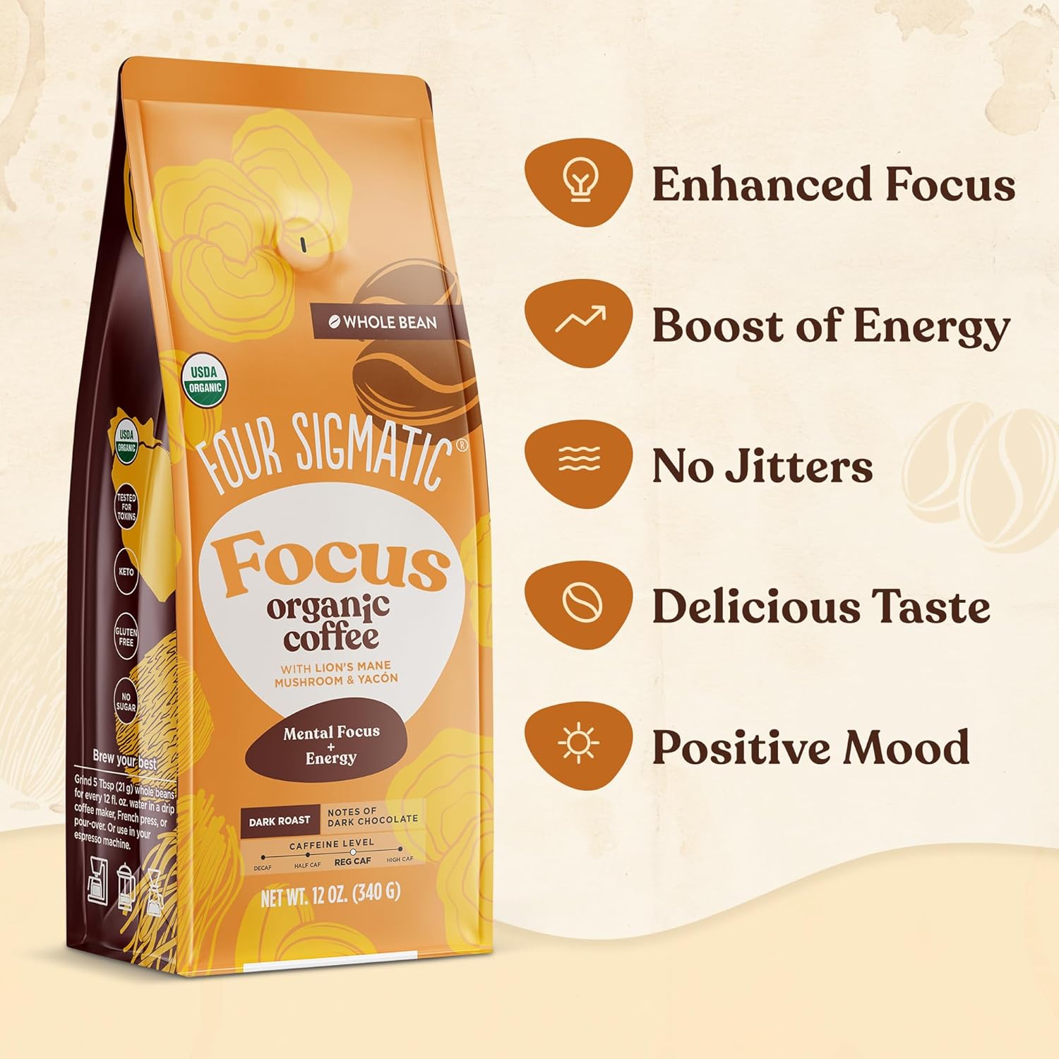 Four Sigmatic Dark Roast Organic Whole Bean Coffee | Gourmet Nootropic Mushroom Coffee Beans with Lion's Mane & Chaga Mushrooms for Enhanced Brain Function and Immune Support | 12oz