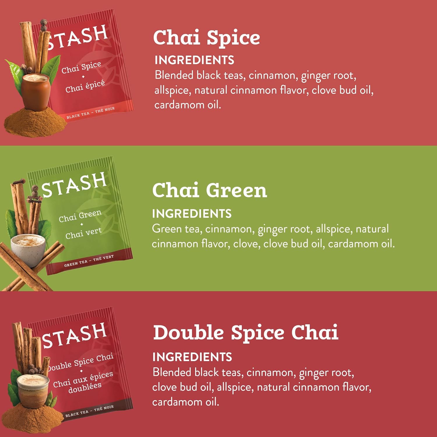 Stash Tea Chai Tea Variety Pack Sampler Assortment - Caffeinated, Non-GMO Project Verified Premium Tea with No Artificial Ingredients, 18-20 Count (Pack of 6)