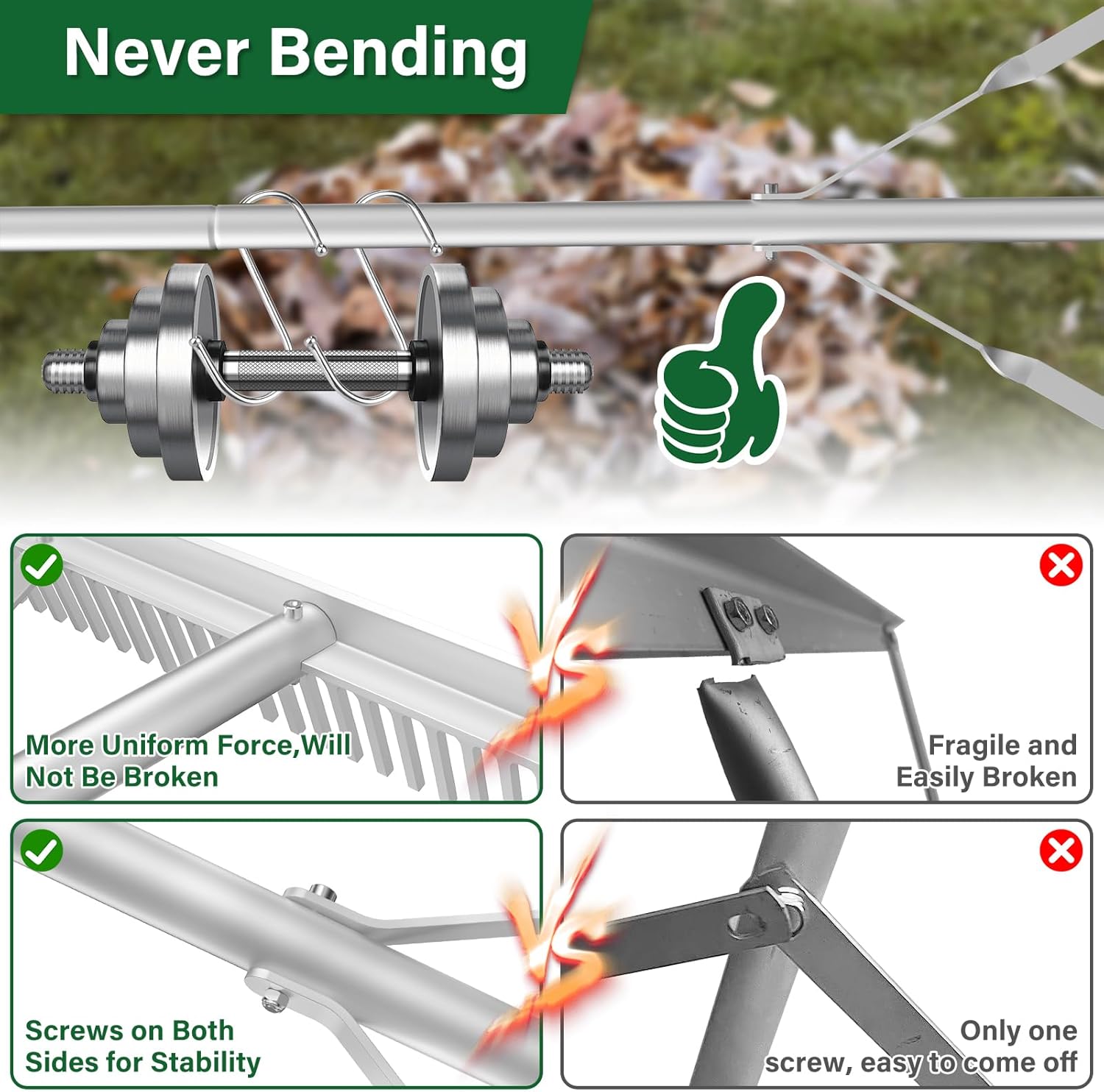 - 𝐀𝐥𝐮𝐦𝐢𝐧𝐢𝐮𝐦 𝐋𝐚𝐧𝐝𝐬𝐜𝐚𝐩𝐞 𝐑𝐚𝐤𝐞 𝟑𝟔'': Landscape rake is made of high quality aluminum,including the landscape rake's teeth and accessories at the joints.high-quality aluminum material can prevent the landscape rake tool rust and extend the service life.the overall weight of the ansgery aluminum landscape rake is lighter than other materials landscape rake,better sturdiness,convenient for you to use more flexible,to bring you a good sense of use experience