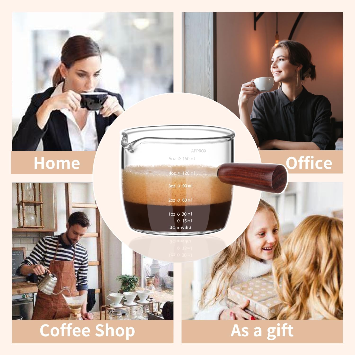 BCnmviku Espresso Shot Glass 150ML/5OZ Triple Pitcher Barista Single Spouts With Wood Handle (1)