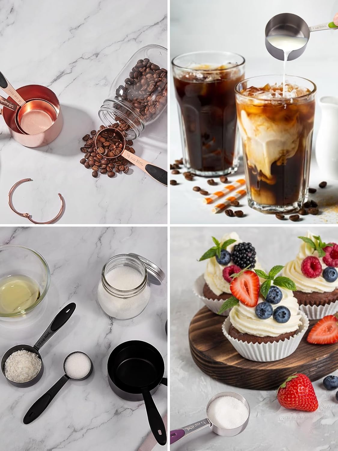 - High Quality: Joyhill's metal measuring cups and measuring spoons set is made from safe stainless steel which is copper-plated, rust-resistant, odorless, sturdy and durable. The smooth surface polishing process leaves no food or liquid residue and no breeding space for bacteria
