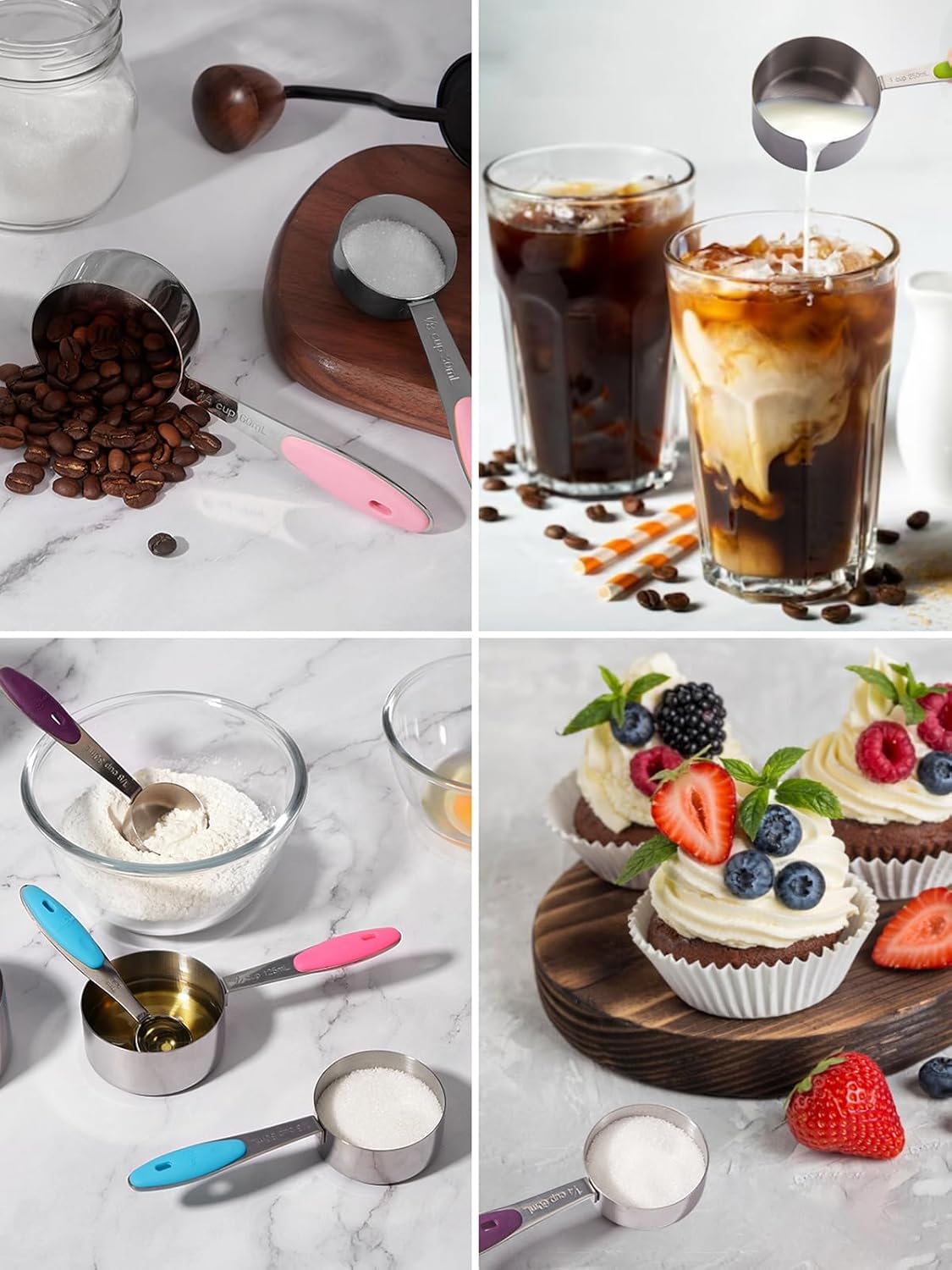 - Keep Your Kitchen Clean & Tidy: Stackable measuring cups and measuring spoons nest inside another for saving kitchen space. Detachable clip rings make measuring cups and spoons easy to organize and store in the drawer, or hang on a kitchen hook. It is sleek and classy. You also can hang them on your kitchen wall as decorations