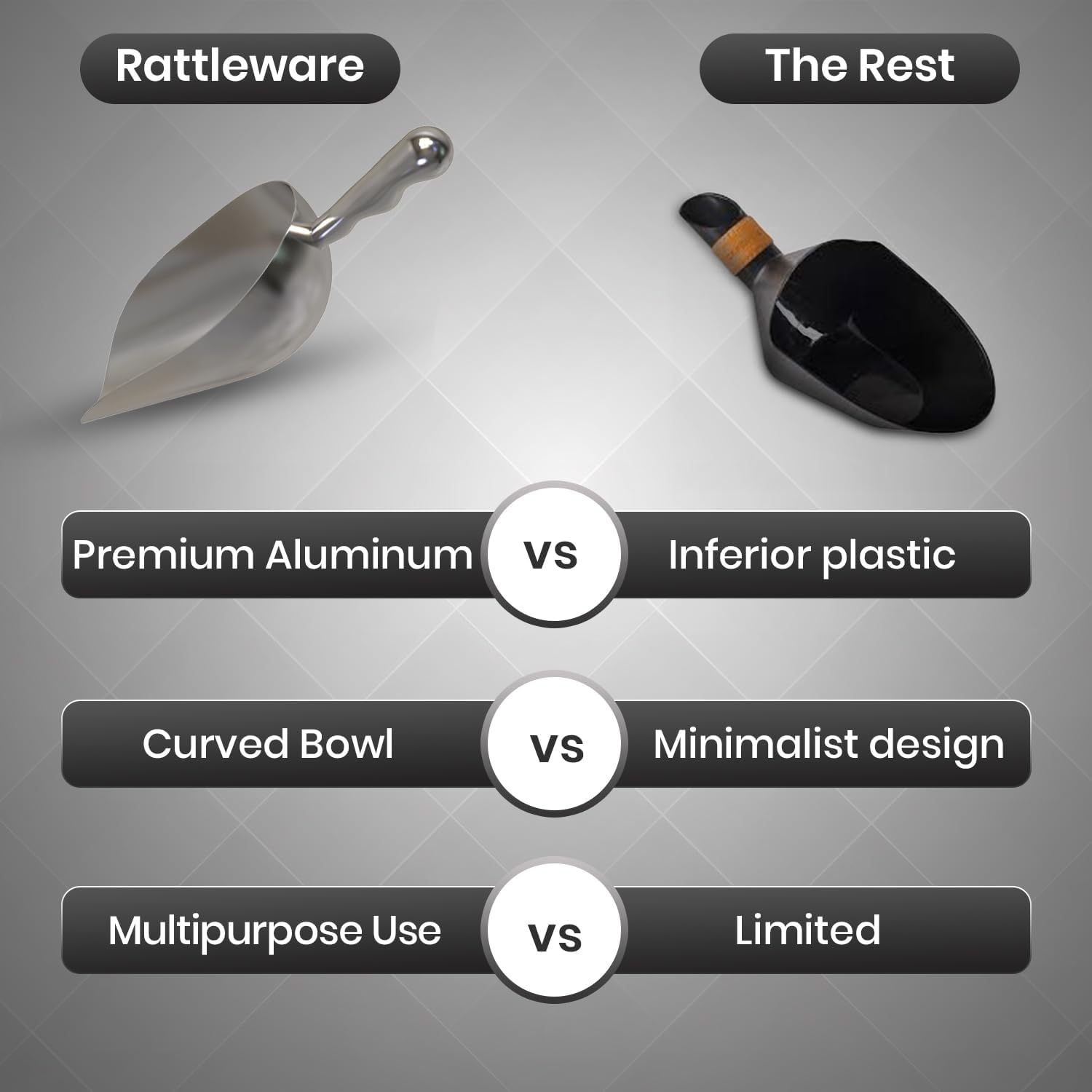 - 𝐈𝐃𝐄𝐀𝐋 𝐅𝐎𝐑 𝐇𝐎𝐌𝐄 & 𝐂𝐎𝐌𝐌𝐄𝐑𝐂𝐈𝐀𝐋 𝐔𝐒𝐄: Rattleware built this aluminum scoop for daily use in cafes, bakeries, food prep, or retail environments. Slim, lightweight design fits easily into storage bins or tool racks.