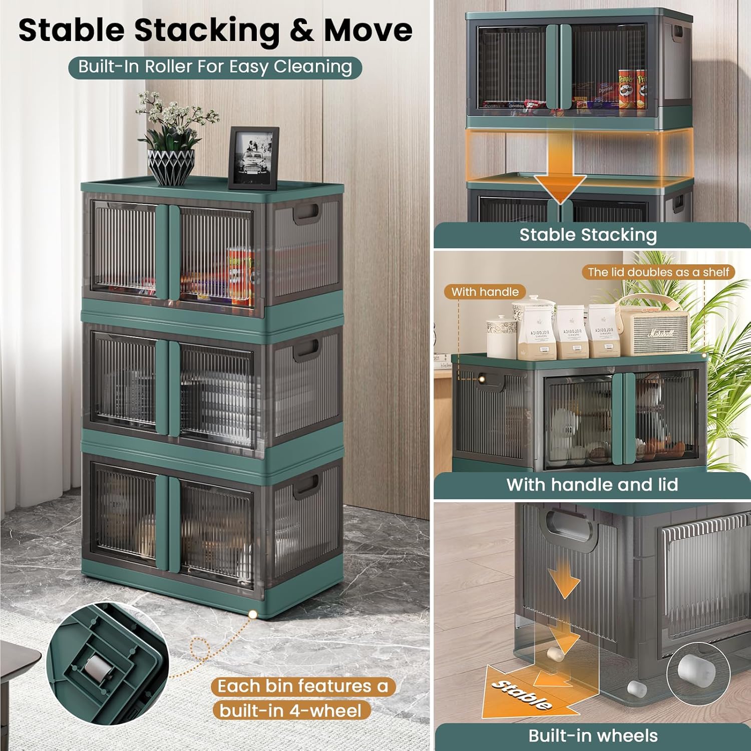 19Gal Collapsible Storage Bins with Lids & Wheels - 3 Pack Stackable with Doors, Heavy-Duty Plastic Containers for Home/Office, Green
