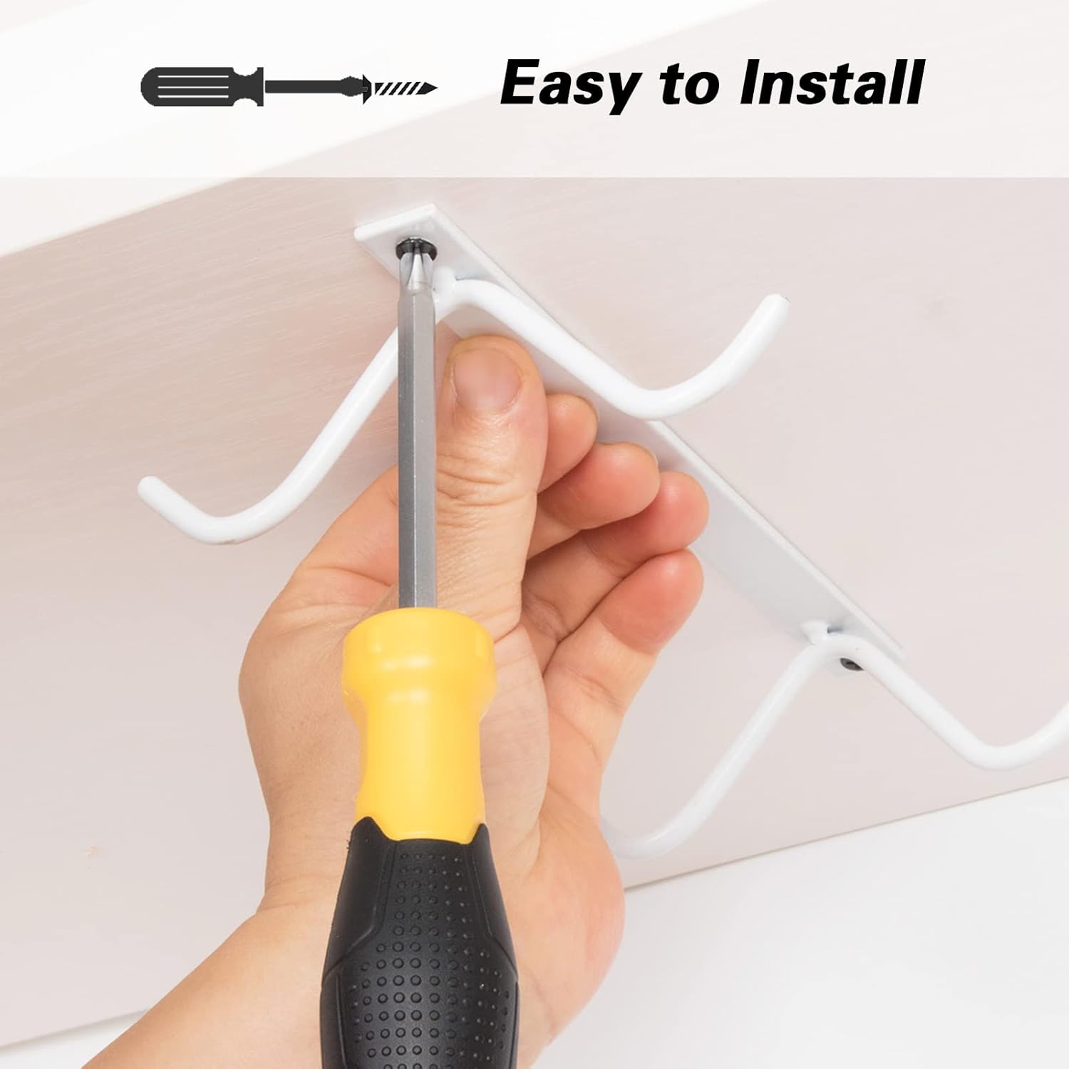 Cabinet Hook Mug Holder - Hanging Coffee Cup Rack for Kitchen, Under Cabinets Metal Hangers Organizer Shelf Storage Utensil (White)