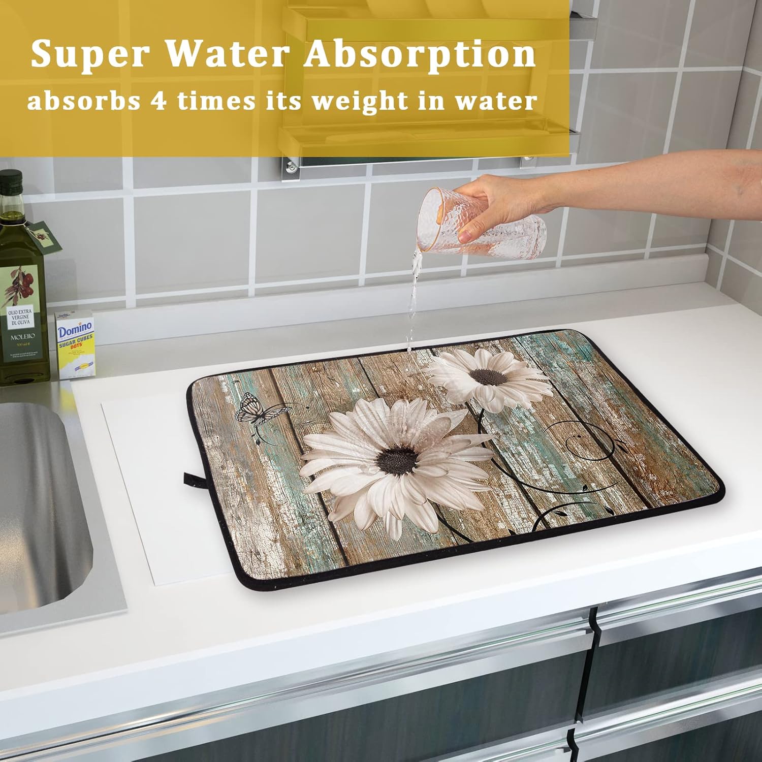 - ❀ 【SPECS & WATERPROOF BACKING】 Made of absorbent fabric, this 3-ply polyester of this Daisy Flower Dish Drying Mat provides a soft cushion. 24" X18", fitting most counters snugly while providing a smart and sharp look, a gorgeous decoration for kitchen. Moreover, the waterproof backing stops liquids from soaking through, damaging or staining the surface below and allows moisture to evaporate quickly at the same time.