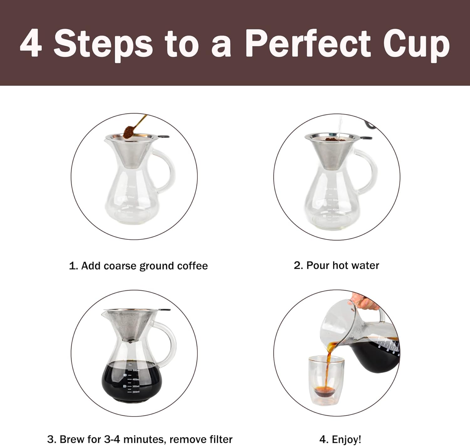 - 【EXCELLENT GIFT】This glass coffee carafe is the best gift for your family, friends, lovers and coffee lovers. It is suitable for making different kinds of coffee or other beverage. And this coffee maker kit are perfect for family, office, party, teatime.