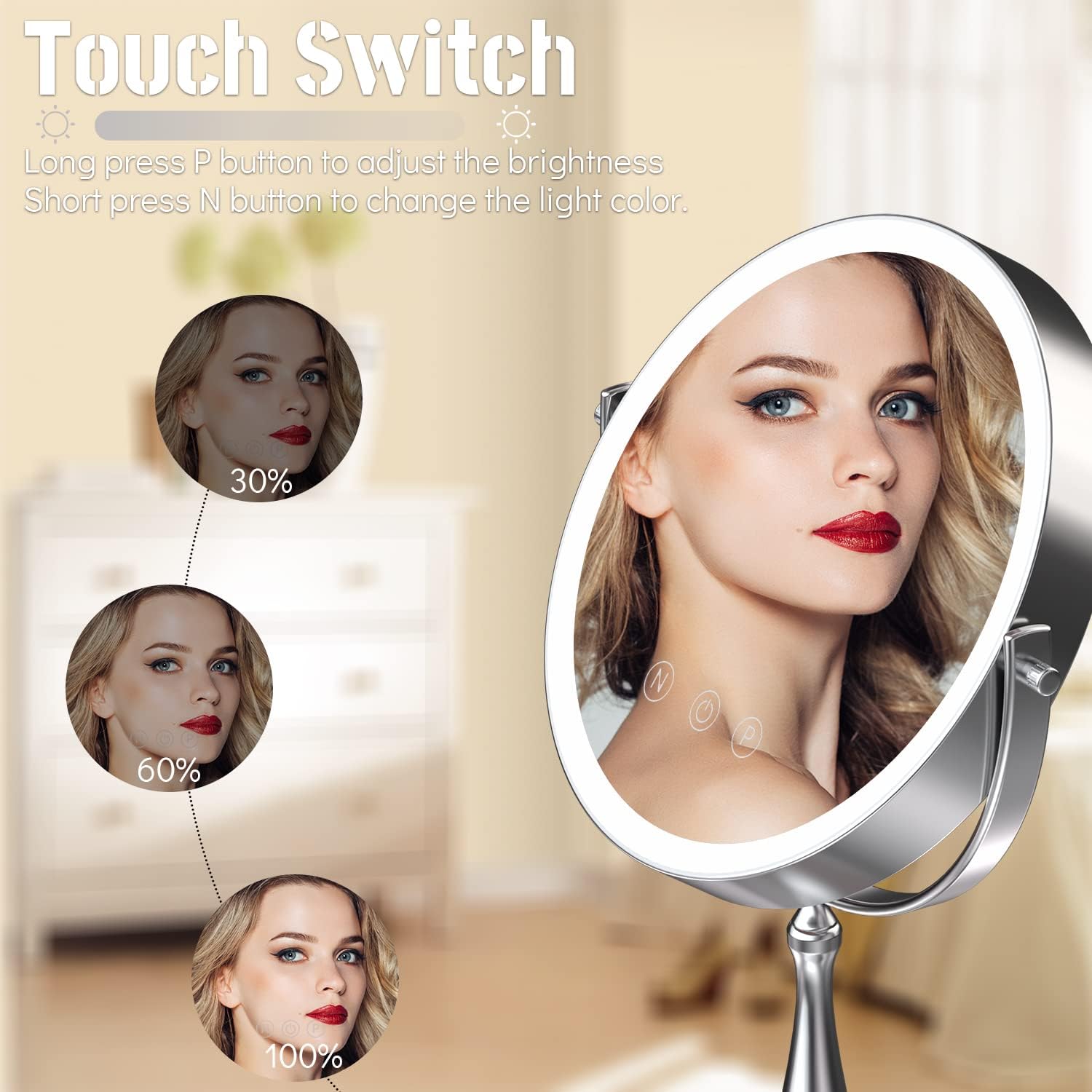 - 【1X/10X Double-Sided Magnifying Mirror】Getting all details of your faces with a 10X magnifying cosmetic mirror, which is ideal for make-up, eyebrow tweezing, facial care, and hair styling. The led makeup mirror can be 360 swivel freely. Easy to find the perfect viewing angle of this vanity mirror with lights without effort.Note: You should be at least with a distance of 4 inches to mirror for a more detailed and less distorted image or dizzying.