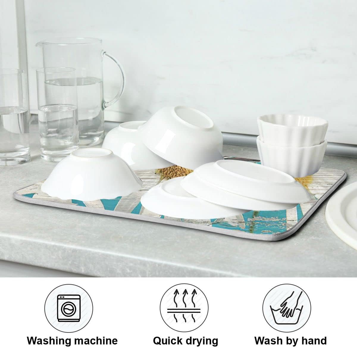 - 3【Unique Design】: Floral dish drying mats with vintage daisy and teal wood pattern, which can add more charming charm to your kitchen office or coffee bar counter. The drying mat for kitchen counter with unique hanging rope design that can be hung without occupying any space,soft and foldable, easy to store.