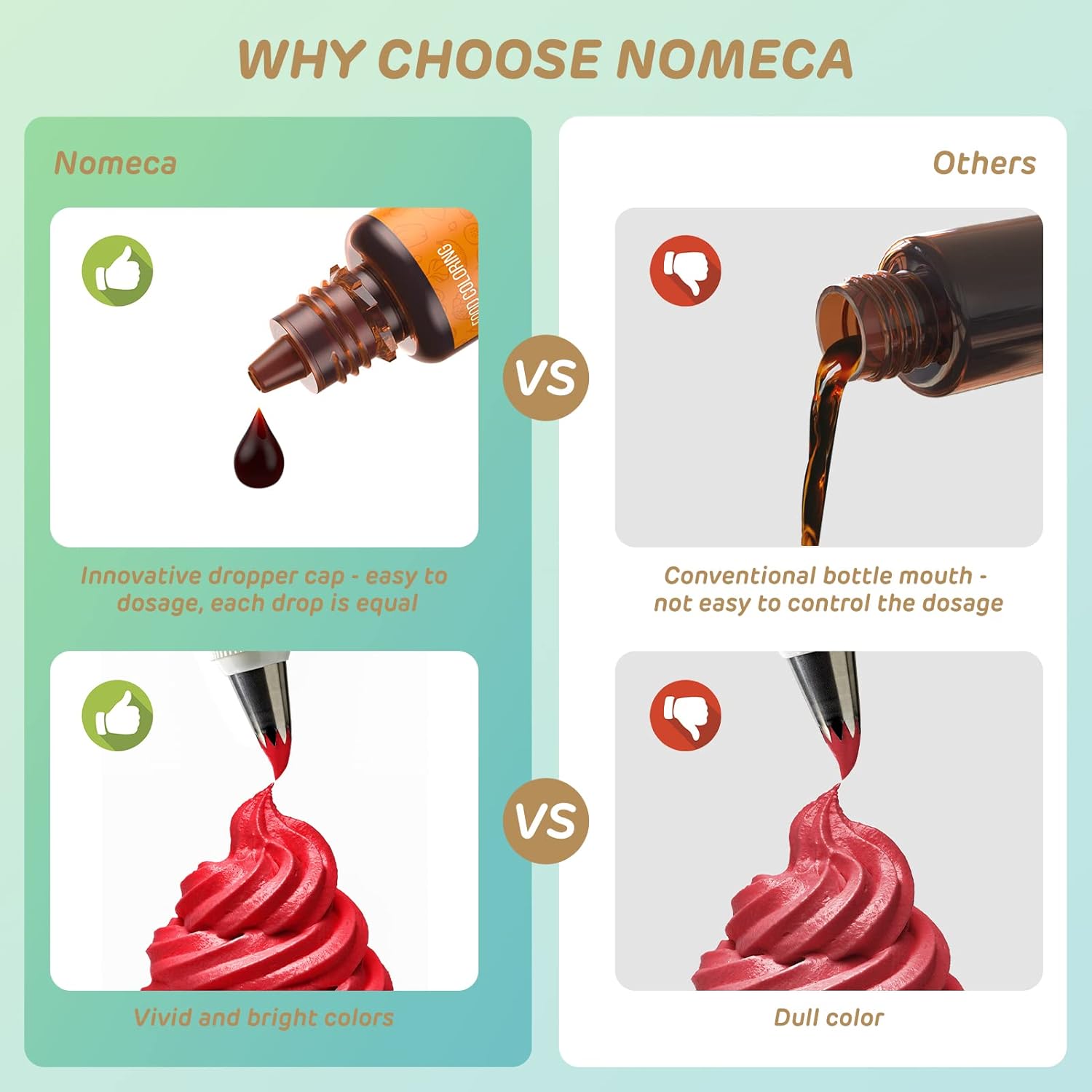 - Food Grade Ingredients: Made from safe ingredients which approved by MSDS, Nomeca food grade liquid food coloring set is totally odorless and tasteless, won't alter the taste or texture of your dessert. Adding unlimited fun to your baking life. What's more, this 12 food coloring set is dairy-free, nut-free, sugar-free and gluten-free, vegetarians can also eat with confidence