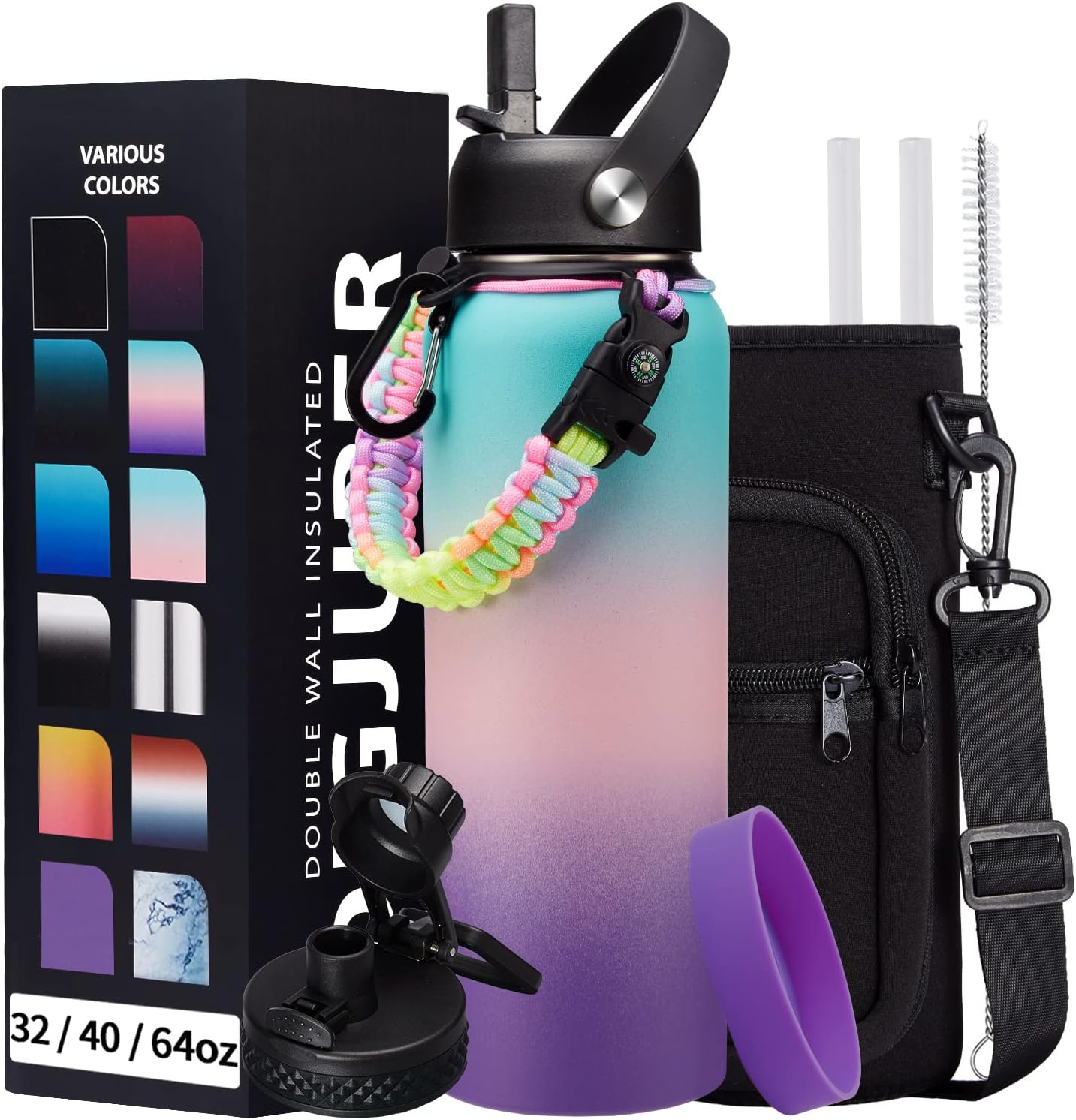 - COMBO—Super Deal: Buy 40oz stainless steel water bottles and get 9 accessories (2 x lids, 1 x survival paracord, 1 x carrying pouch, 1 x shoulder strap, 1 x protective cup mat, 2 x straws, 1 x straw brush). WITH A LIFETIME GUARANTEE, these thermal water bottles are the perfect gift for use at home, work, school, road trips, hiking, sporting events, or just hanging out