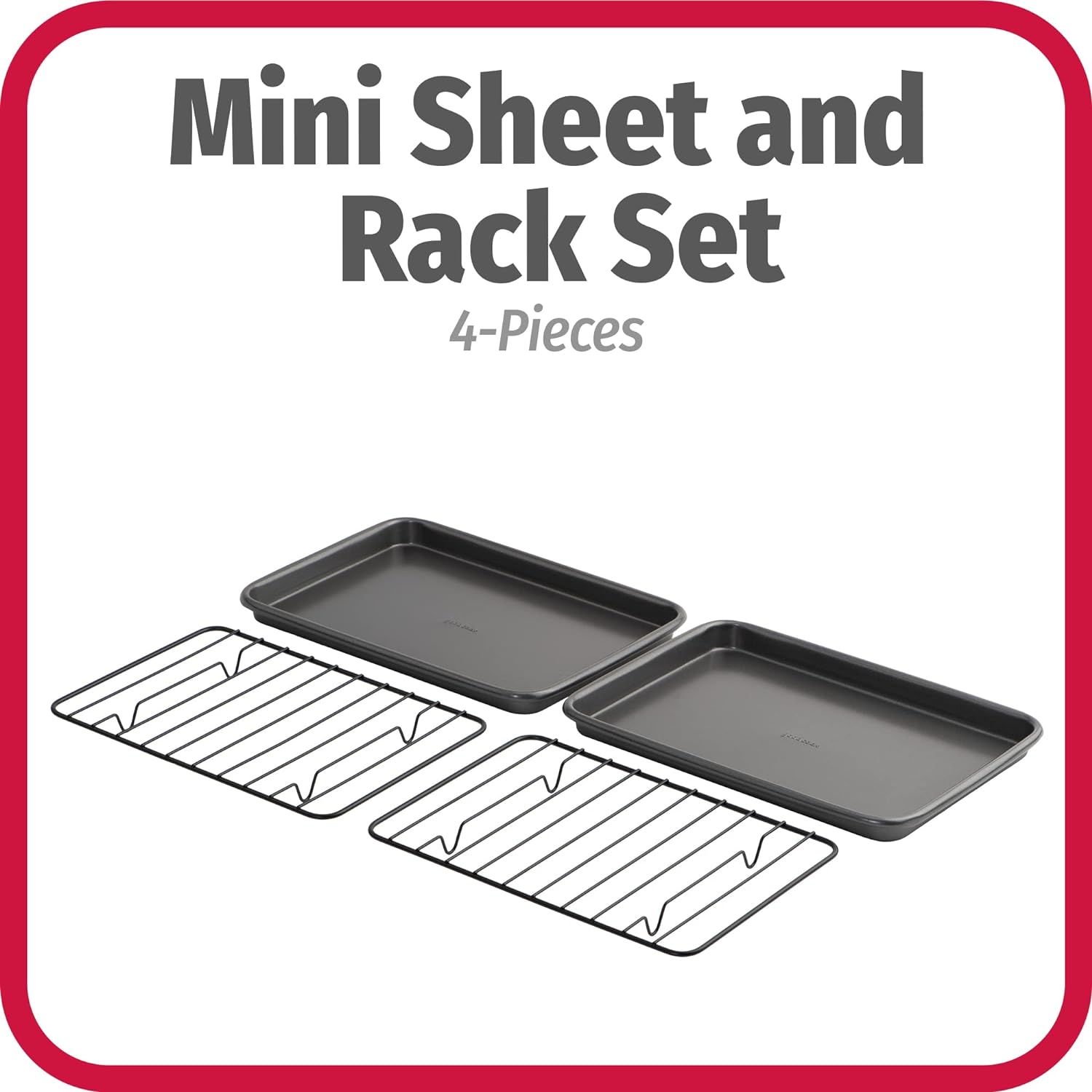 - SET OF 2 MINI BAKING SHEETS WITH RACKS: Comes with 2 mini 9" x 6.2" baking sheets and coordinating 8.7" x 5.9" racks for your favorite toaster oven dishes
