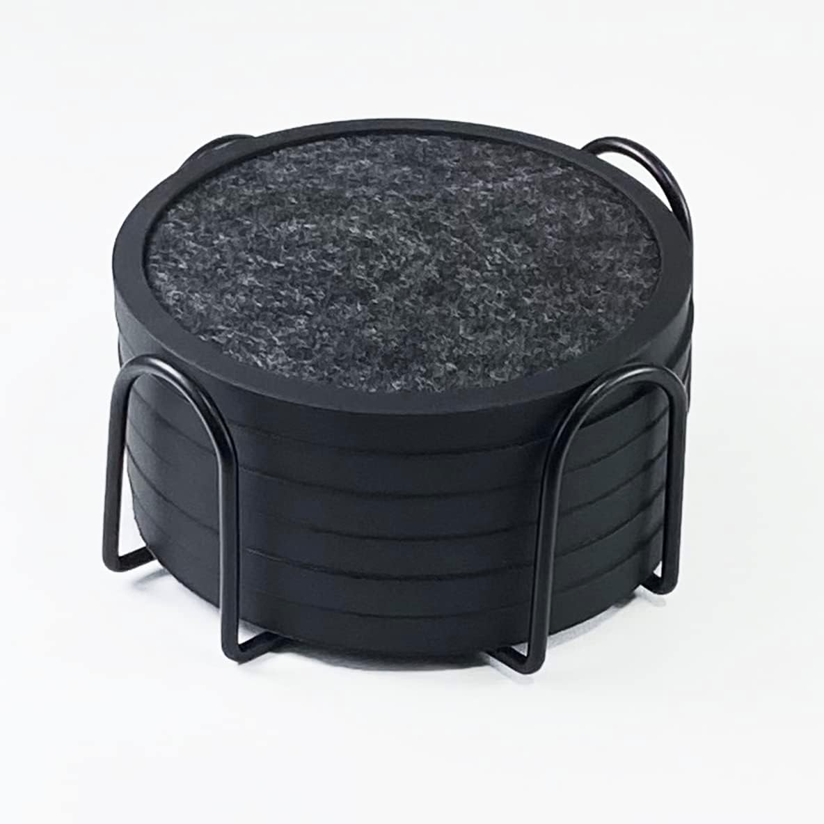 - What You Get: 6 non-slip silicone drink coasters(round, black, 4.3 inch), 6 absorbent felt inserts(round, gray) and a 4.5-inch metal holder(black). The silicone coasters can be used alone, or with the inserts. Fits all types of bottles/cups/mugs/tumblers