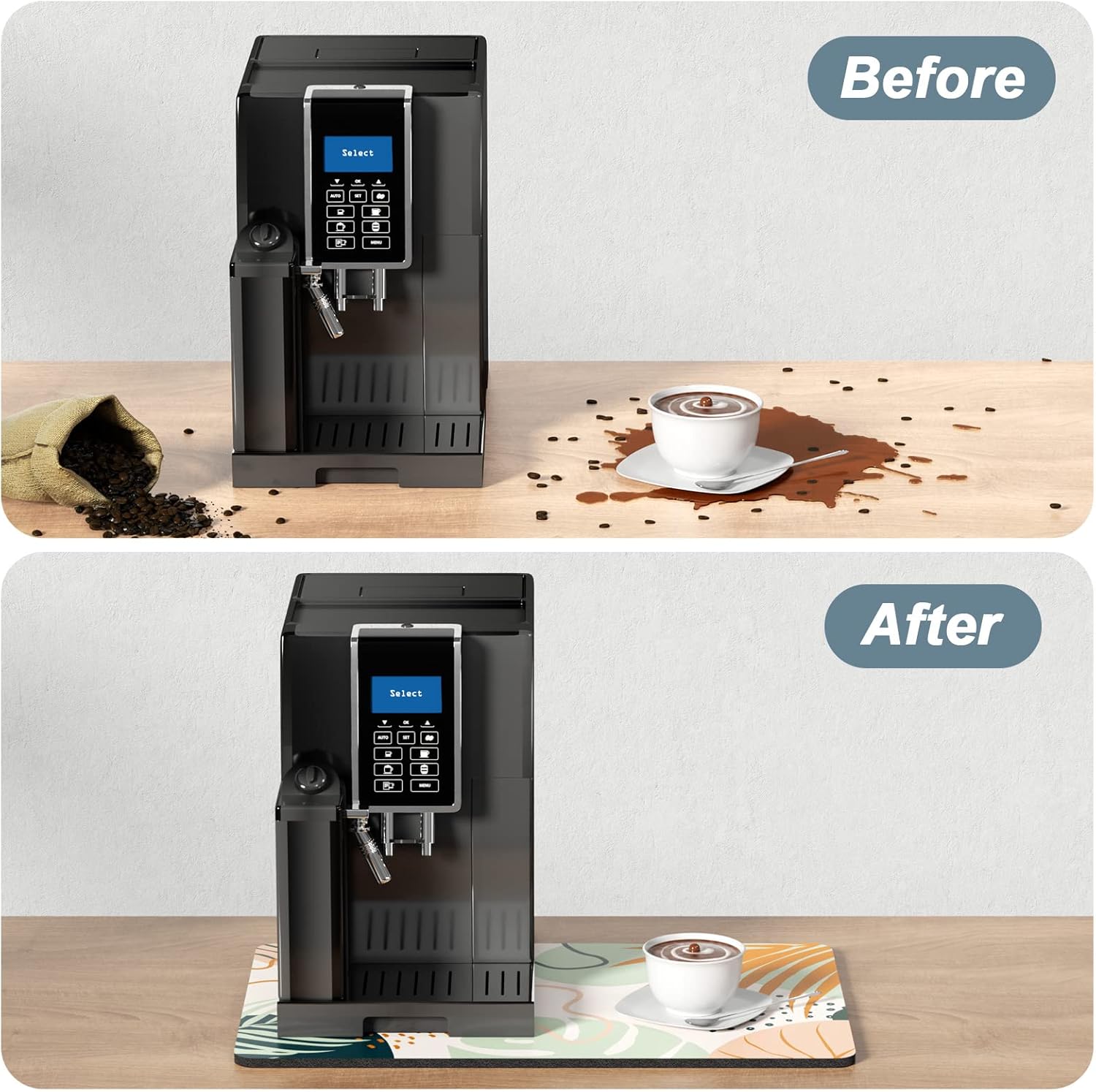 - Easy to Clean: The coffee bar mats for countertop can be cleaned with hand or machine to remove stains, up to 91% porosity material allows coffee bar mats to dry quickly without a machine
