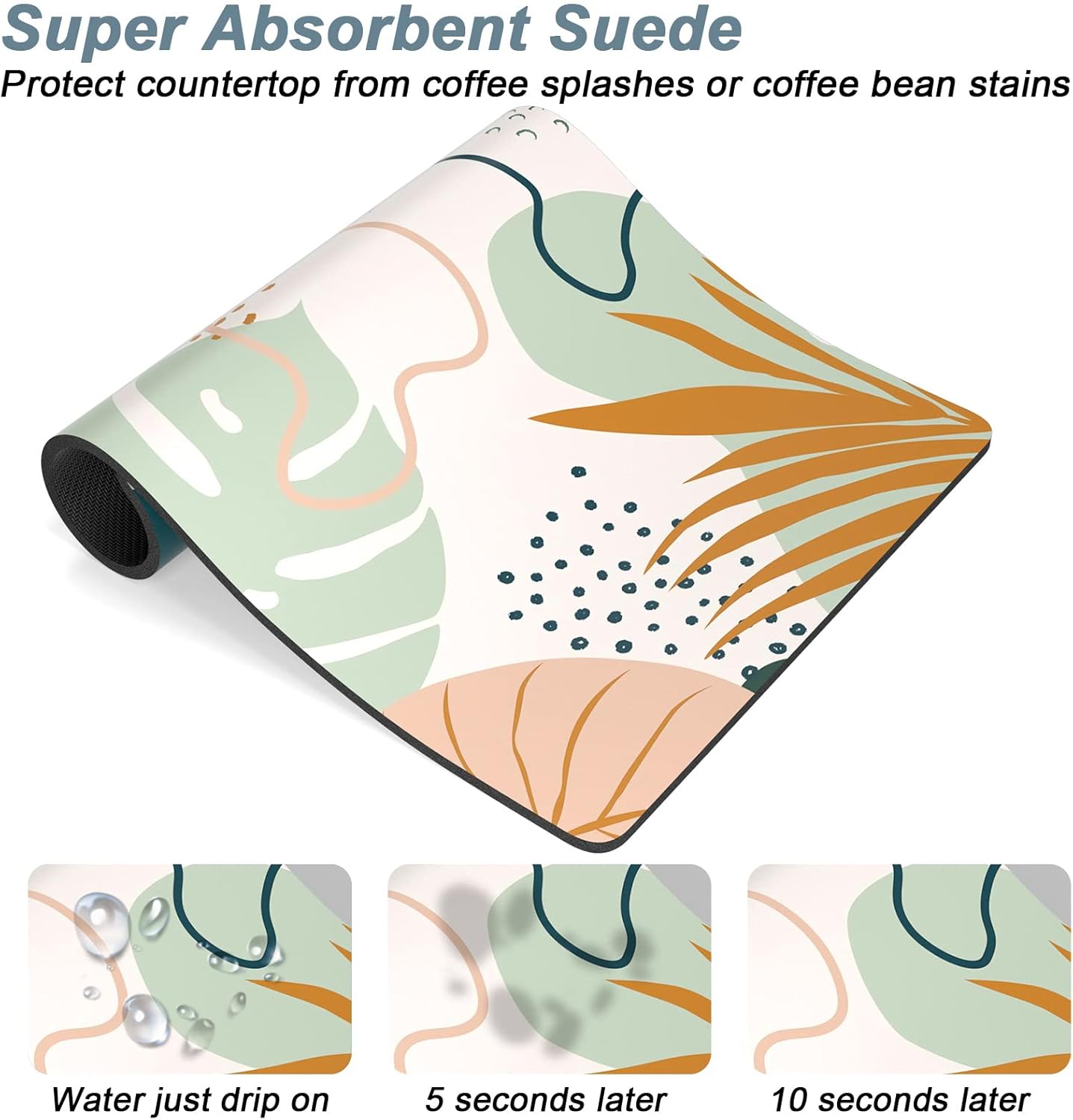 - Super Absorbent and Non-slip: Coffee bar decor mat is crafted from absorbent suede and anti-slip rubber. The surface is soft, heat-proofand and can quickly absorb liquid. The anti-slip rubber backing can firmly grip the floor without unwanted sliding