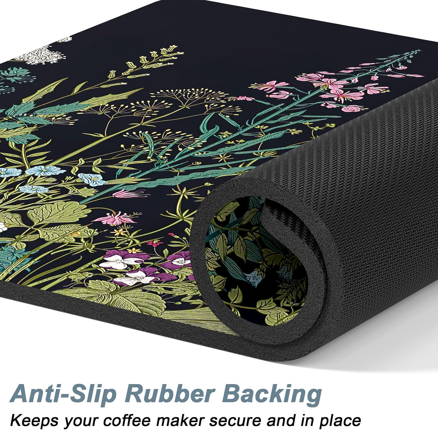 Rnivvi Coffee Mat, 16" x 24" Cute Flower Theme Coffee Bar Mats for Espresso Machine Station Accessories and Organizer, Hide Stain Rubber Backed Absorbent Dish Drying Pad for Kitchen Counter, Black