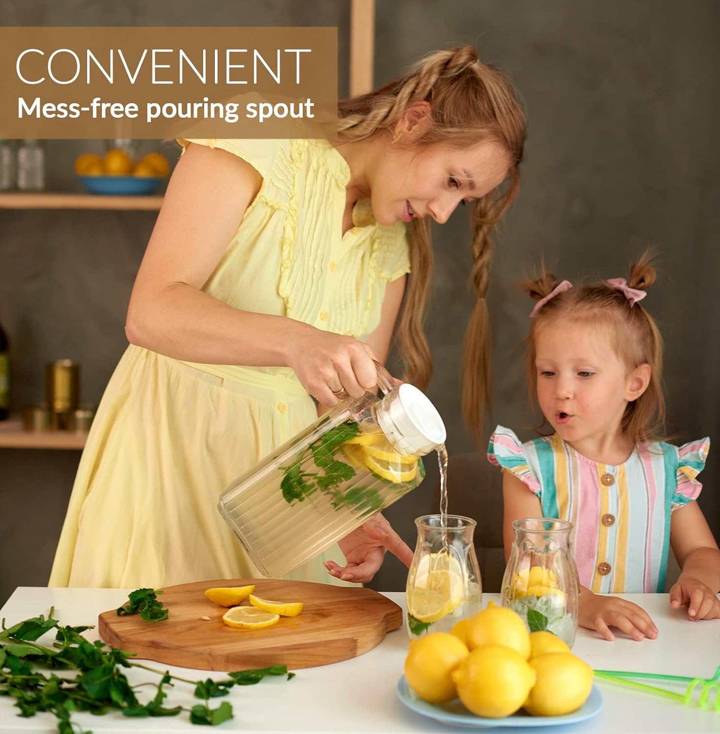 Glass Pitcher with Lid – Set of 2 Glass Water Pitcher 55Oz – Cold Carafe for Ice Tea, Water, Lemonade, Coffee – Elegant and Modern – Practical Spout Pitchers for Drinks