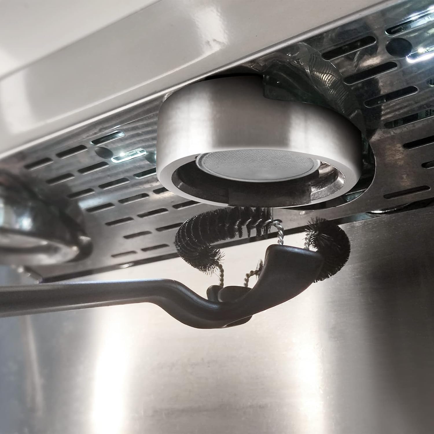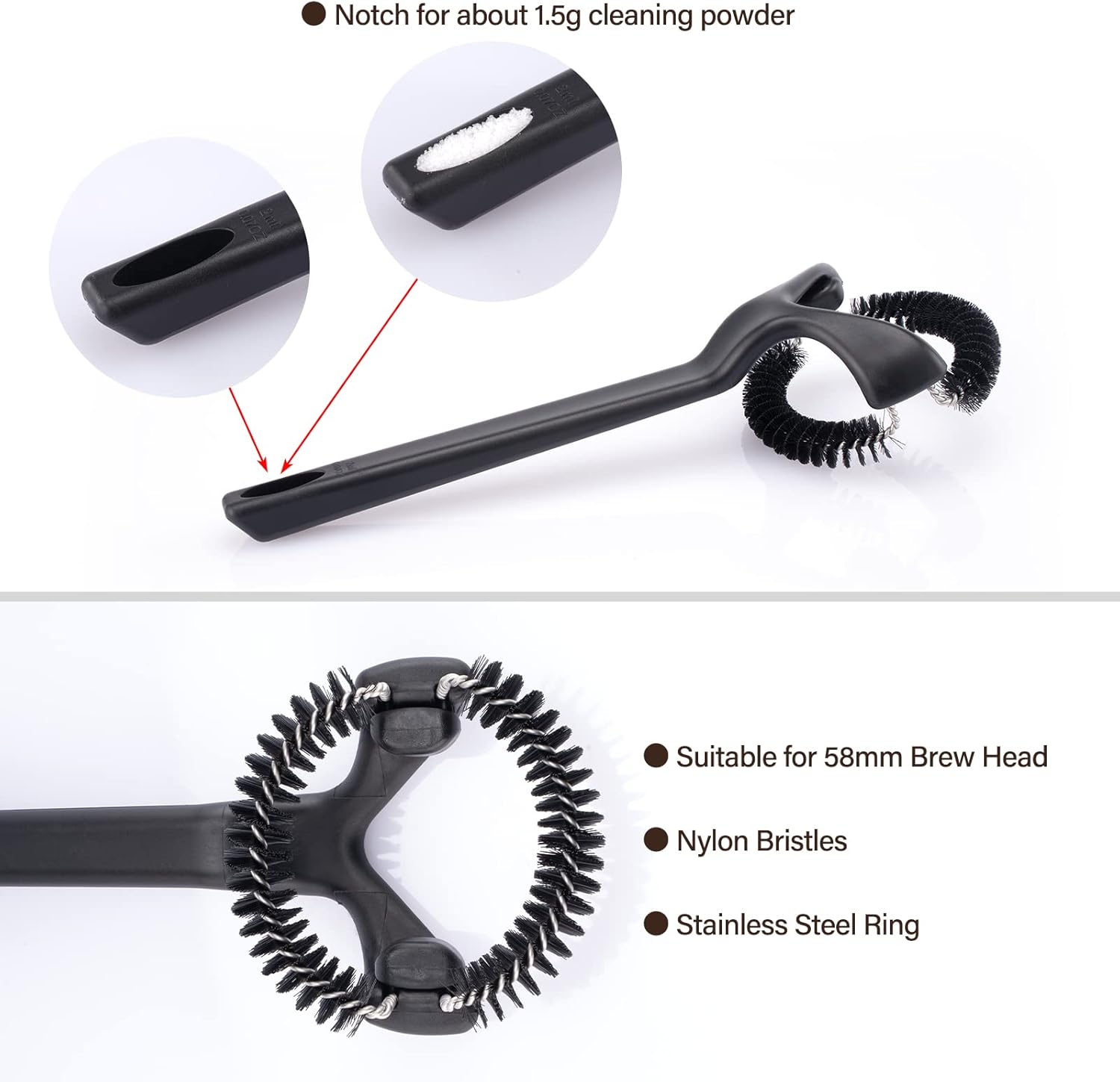 - ESPRESSO MACHINE CLEANING BRUSH- The brew head coffee brush is made of high-quality nylon bristles, a stainless-steel ring, and designed in a curved head for scrubbing the hard-to-reach corner of the machine.