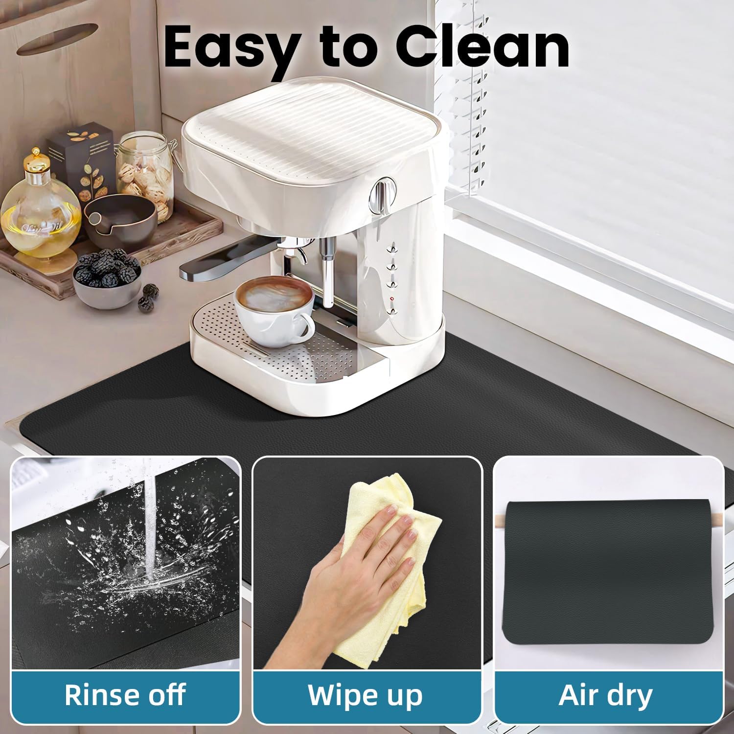 - Anti-Slip Rubber Backed: The bottom of this coffee machine mat is made of non-slip rubber, it will not move on the countertop. The rubber backing can protect your countertop from being damaged, it's the functional coffee accessories for coffee bar