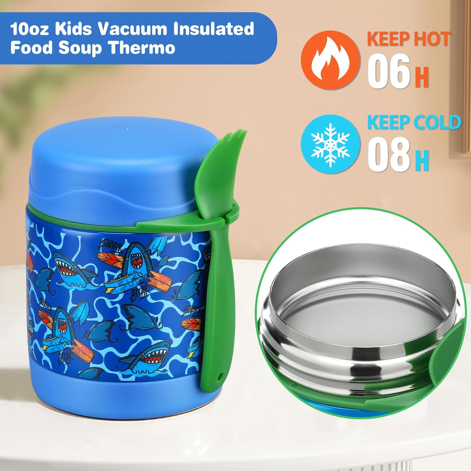 - Thermo for Hot&Cold Food: Our soup thermo with the insulated 18/8 (SUS304) stainless steel interior with vacuum seal.This will keep your little kids meals warm or cool for 5+ hours, and equipped with a plastic spoon.