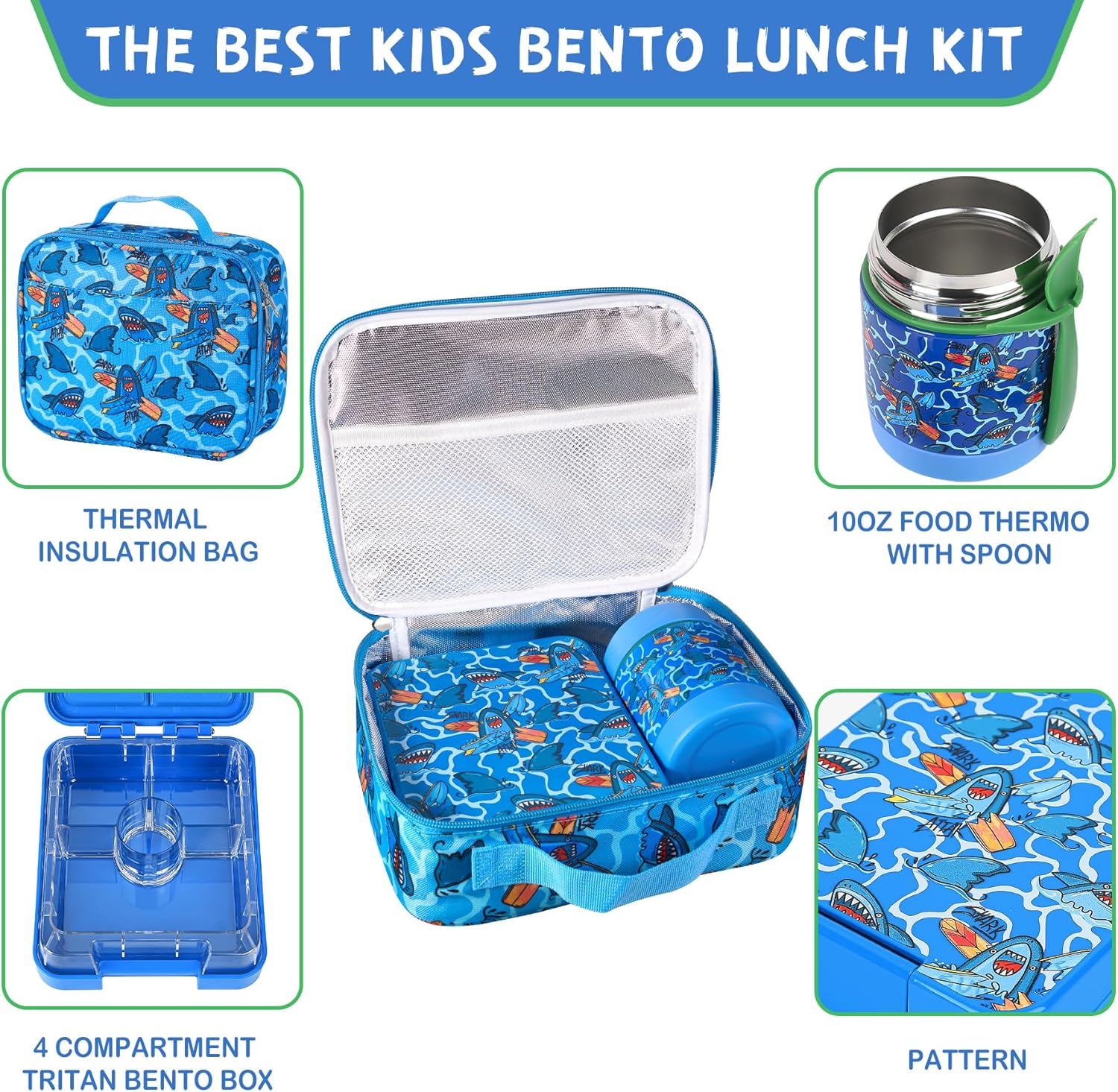 Bento Lunch Box Set With 10oz Soup Thermo, Leak-proof Lunch Containers with 4 Compartment, Kids Hot Thermo Food Jar/Insulation Lunch Bag, Food Containers for School(Shark)