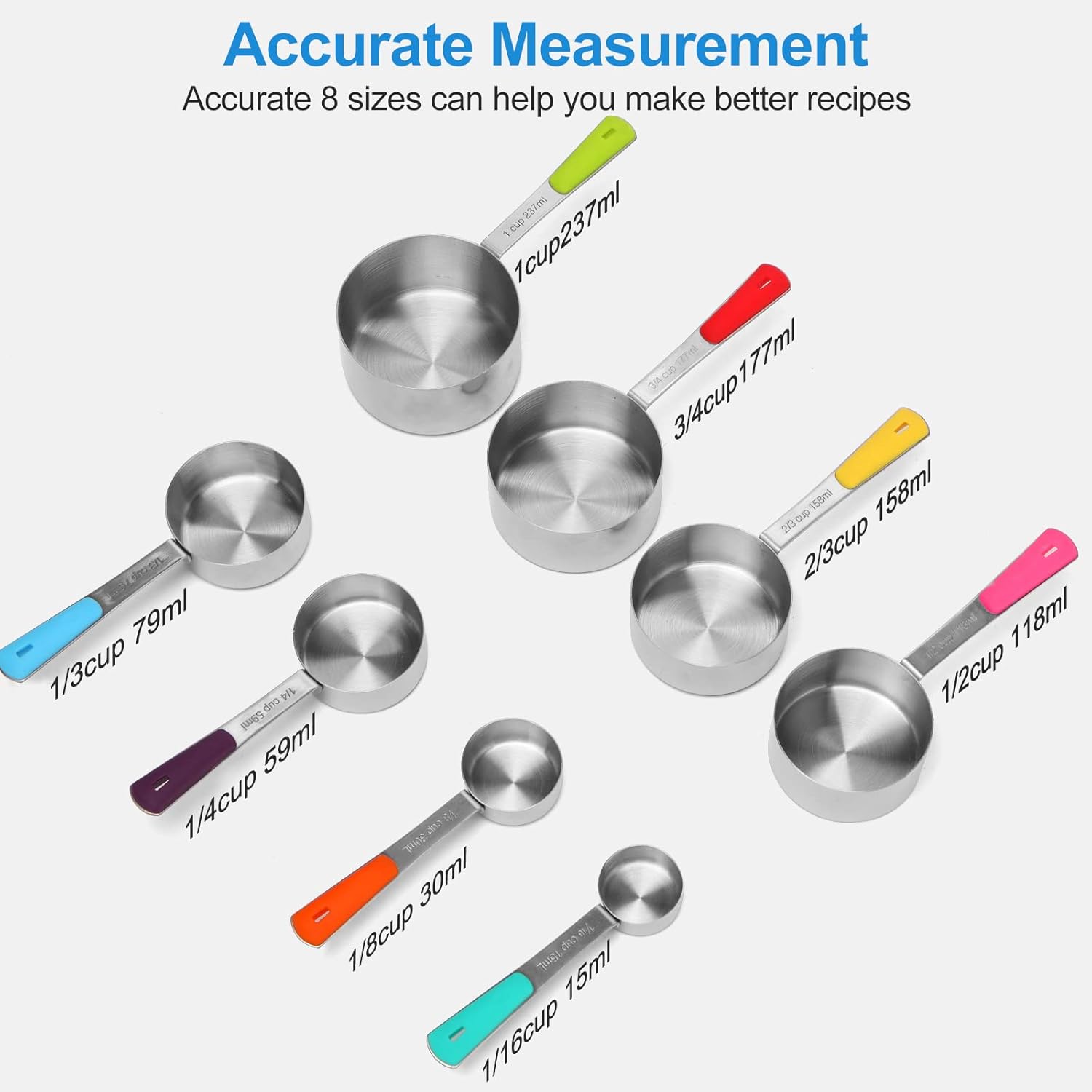 - Cup measuring set includes 8 measuring cups 1/16, 1/8, 1/4, 1/3, 1/2, 2/3, 3/4,1.