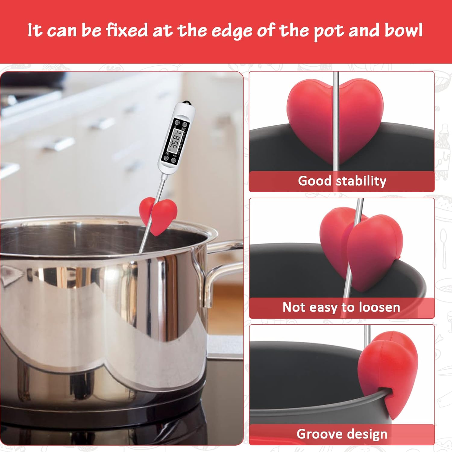 - [ High-Temperature Resistance ]: The thermometer holder can withstand a high temperature of up to 446 ° F and is suitable for cooking most foods. (Do not touch the open flame or put it into the oven)
