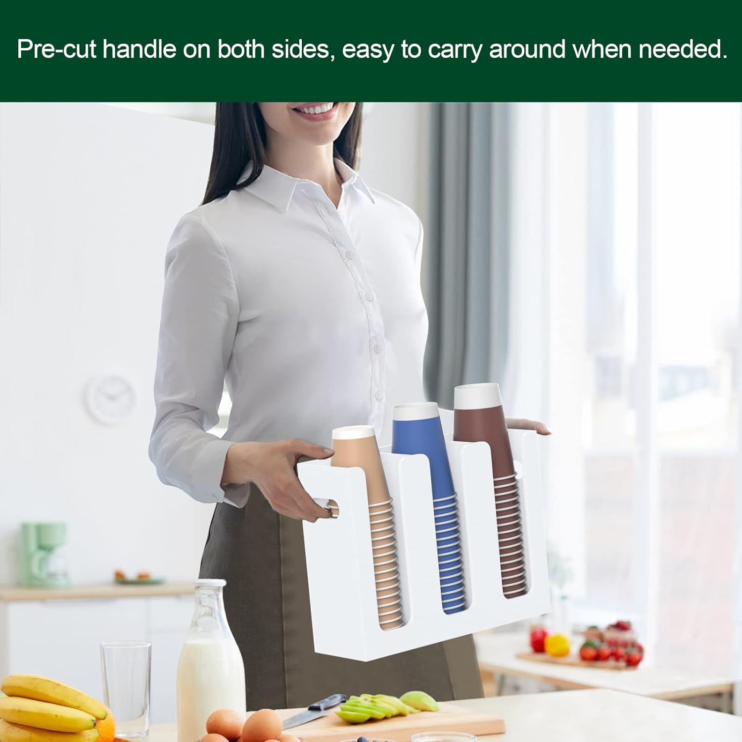 - Cup Dispenser with Handles on Both Sides - pre-drilled handles on side and holes on back, provides more possibilities, either mount it on wall of your kitchen or office, or let it stand along the side of your cabinet in the trailer, you make the decision.